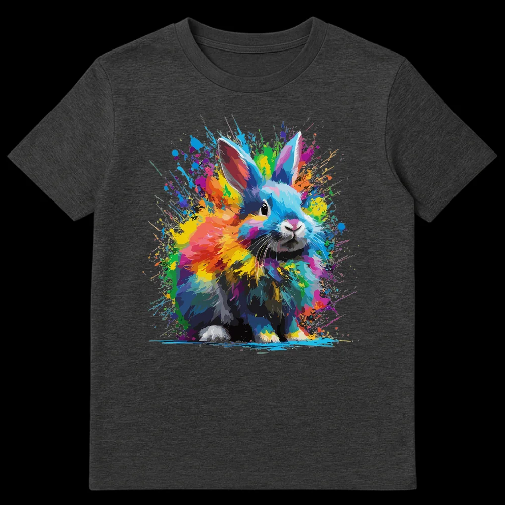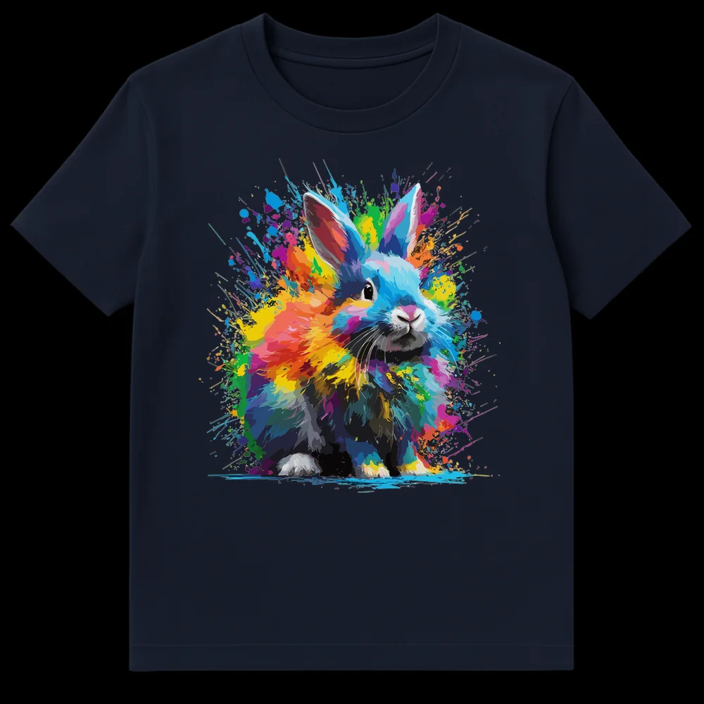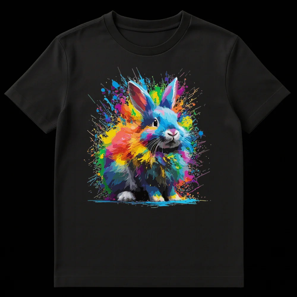 Celebrate the charm of bunnies with this eye-catching, vibrant splatter paint rabbit t-shirt. Featuring a kaleidoscope of colors on a black background, this artistic graphic tee transforms a cute bunny into a dynamic abstract expressionist masterpiece. It’s perfect for animal enthusiasts, art lovers, or anyone seeking a unique, cheerful fashion statement.
