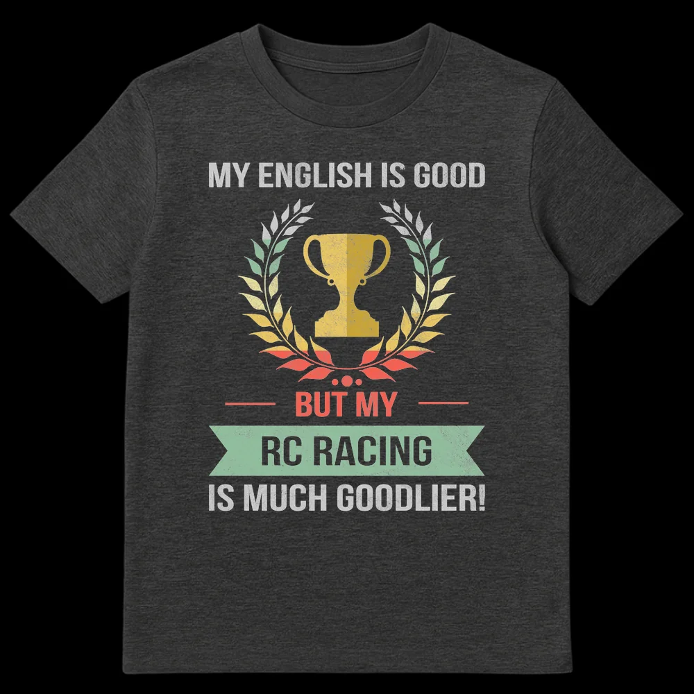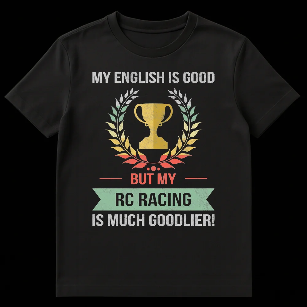 Show off your passion with the “MY ENGLISH IS GOOD BUT MY RC RACING IS MUCH GOODLIER!” t-shirt. This clever design features a vintage trophy and laurel wreath, celebrating the ultimate dedication to RC racing with a humorous grammatical twist. It’s the perfect funny gift for any devoted RC car, truck, or drone hobbyist who prioritizes their track skills above all else.