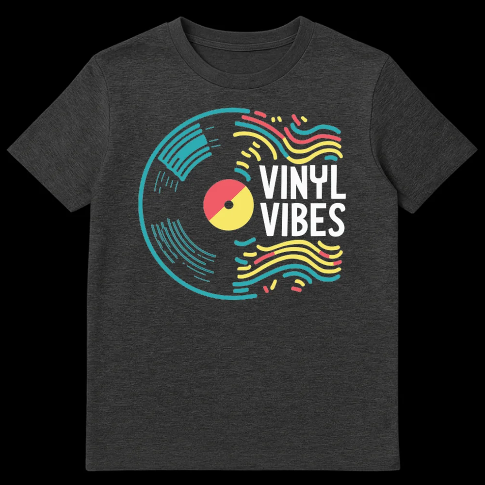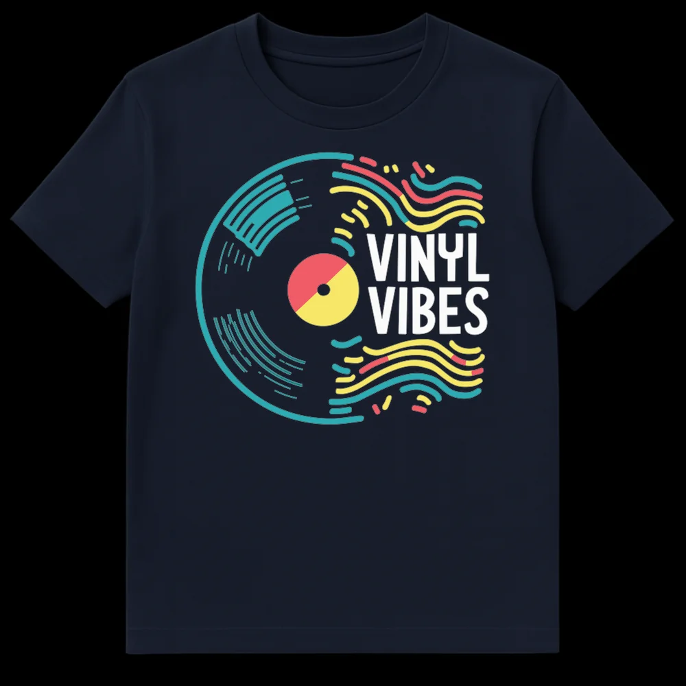 Immerse yourself in the world of analog music with our “VINYL VIBES” t-shirt, a stylish tribute to record collectors and audiophiles. This design captures the essence of listening to vinyl with its bold, modern abstract minimalism, reminiscent of retro-pop and synthwave aesthetics. The central stylized vinyl record, adorned with energetic sound wave patterns in eye-catching teal, yellow, and coral against a stark black background, makes a clear statement. “VINYL VIBES” isn’t just a phrase; it’s a declaration of a lifestyle—a celebration of the warm sound, tactile ritual, and authentic connection to music that only vinyl provides. This shirt is an ideal gift for music lovers, DJs, and anyone who cherishes the golden era of records and the enduring coolness of vinyl culture. Wear your passion and share your good “VINYL VIBES” with the world.