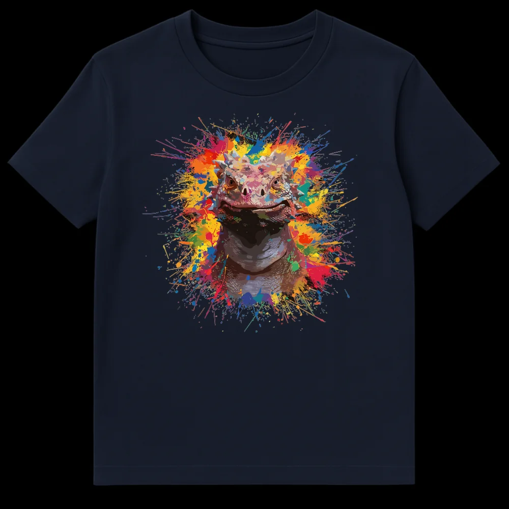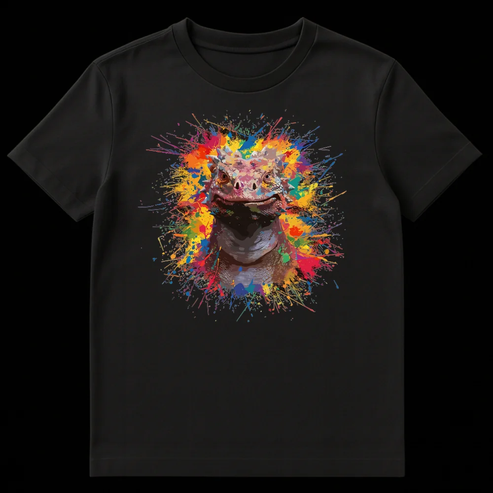 Unleash your wild side with our vibrant Bearded Dragon t-shirt, a stunning fusion of realism and explosive pop art. This unique design features a detailed lizard head emerging from a chaotic burst of rainbow paint splatters against a stark black background. It’s a perfect gift for reptile enthusiasts, art lovers, or anyone who appreciates bold, expressive animal art and wants to make a colorful statement.