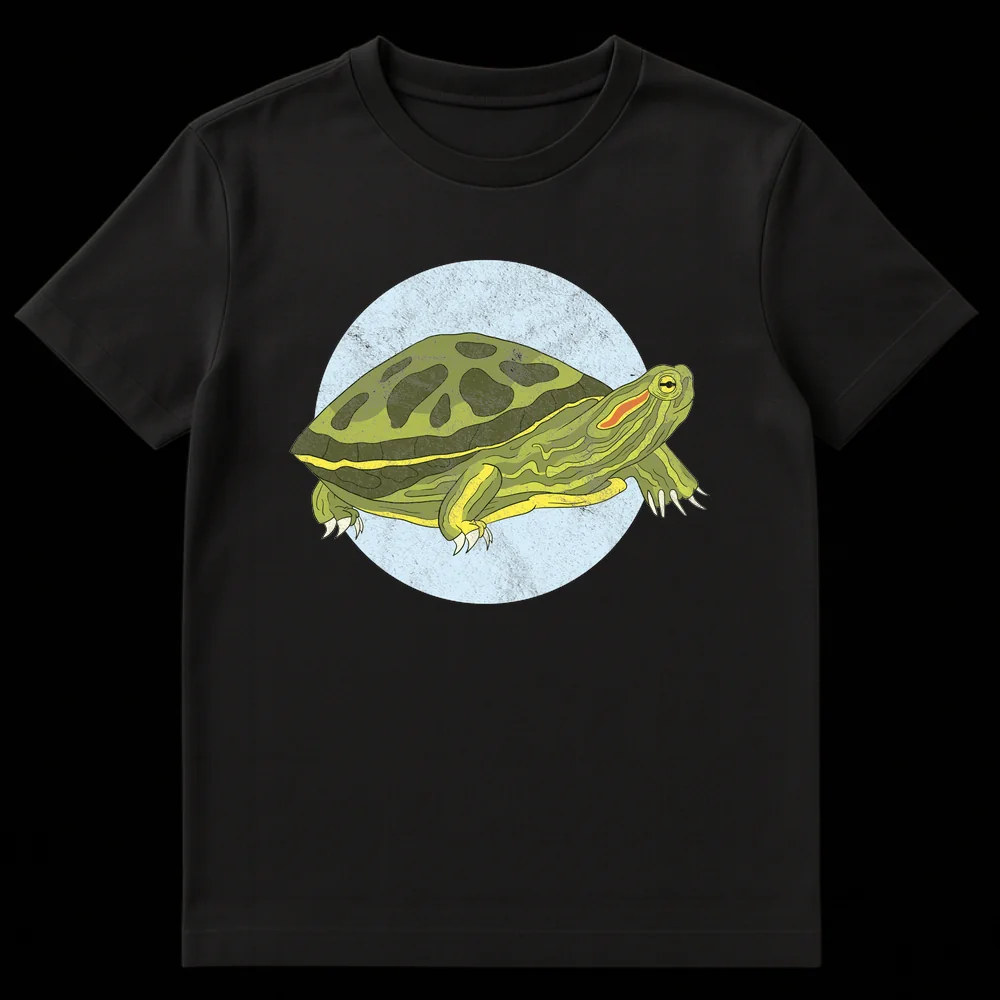Showcase your love for the natural world with our captivating Red-Eared Slider turtle t-shirt. This design features a meticulously stylized illustration of the iconic Red-Eared Slider, instantly recognizable by its distinctive red stripe, depicted with vibrant greens and yellows. The art boasts a unique distressed texture overlay, giving it a cool, vintage-inspired feel, perfectly set against a muted blue circular background and a striking black tee. It’s more than just a shirt; it’s a statement of appreciation for these fascinating aquatic creatures. Perfect for turtle enthusiasts, reptile owners, zoology students, or anyone who cherishes wildlife, this tee offers a blend of artistic style and natural admiration, making it an exceptional gift that truly stands out.