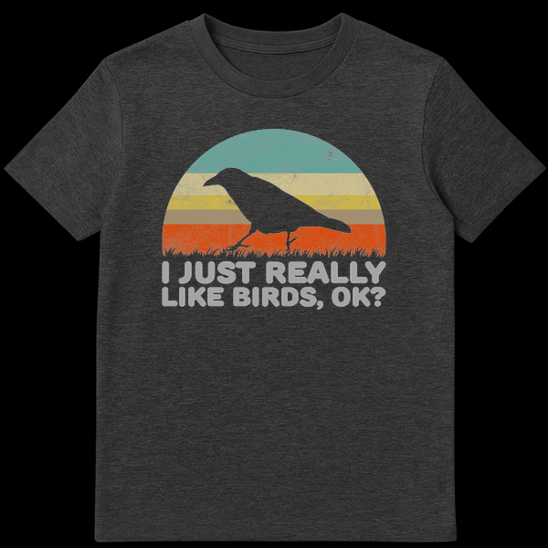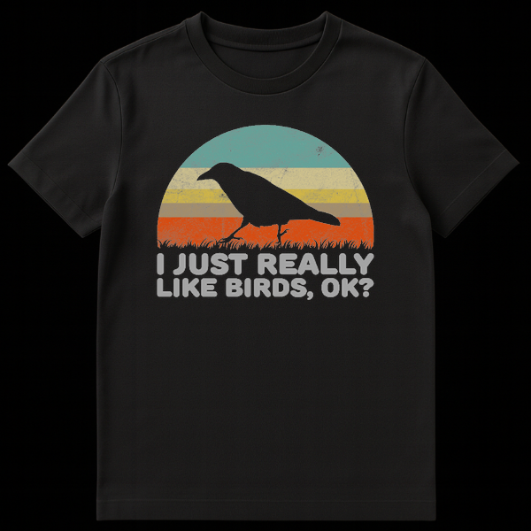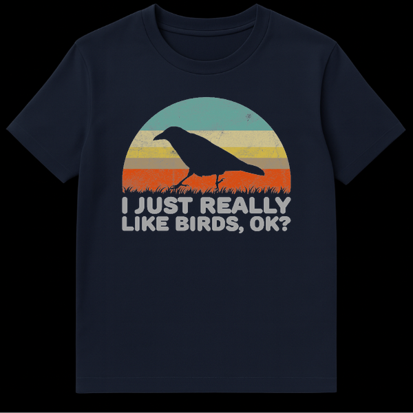 Embrace your inner bird enthusiast with this unique vintage-style t-shirt. Featuring a striking crow silhouette against a retro striped sunset and the humorous text “I JUST REALLY LIKE BIRDS, OK?”, it’s perfect for anyone who truly adores our feathered friends. This design makes a fantastic gift for birdwatchers, nature lovers, or anyone with a quirky sense of humor.
