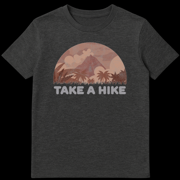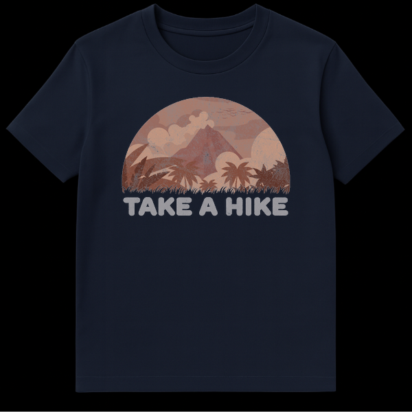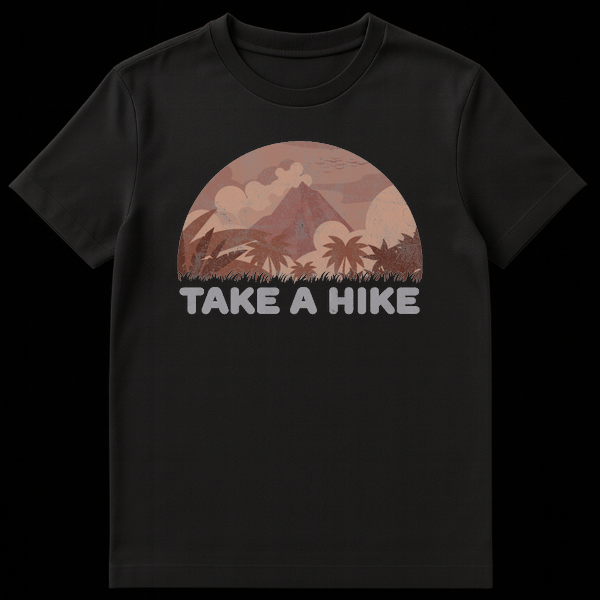 Step into adventure (or just away from annoying conversations) with our Retro Mountain Hiking Nature T-Shirt. This design captures the spirit of exploration with a beautifully illustrated semi-circle landscape, showcasing a majestic mountain peak surrounded by tropical palms and billowy clouds. The entire graphic is treated with a vintage, weathered texture that gives it the soft, worn-in look of your favorite thrift store find. The bold text “TAKE A HIKE” serves as a clever double meaning: it’s an inspiring call to explore the wilderness, but also a humorous, tongue-in-cheek dismissal for when you need some alone time. This shirt makes a fantastic gift for outdoor enthusiasts, introverts, campers, and anyone who appreciates retro aesthetics with a side of sass.