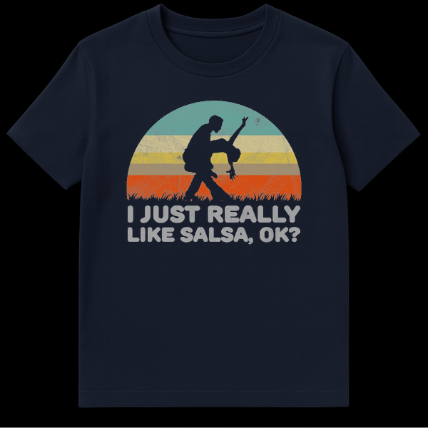 Embrace your passion for the dance floor with this retro-inspired design featuring a classic Salsa dip silhouette against a vintage sunset. The humorous text, “I JUST REALLY LIKE SALSA, OK?” playfully defends your obsession with Latin dance rhythms. This graphic tee is the perfect gift for dedicated Salsa dancers, instructors, or anyone who can’t stop moving their feet.