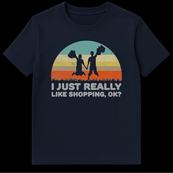 Embrace your inner shopaholic with this hilarious retro-style graphic tee featuring a vintage sunset and joyful shoppers. The bold text ‘I JUST REALLY LIKE SHOPPING, OK?’ perfectly captures the defensive humor of anyone who considers retail therapy a serious hobby. With its distressed 70s aesthetic, this shirt makes a fantastic gift for the fashionista or bargain hunter in your life.