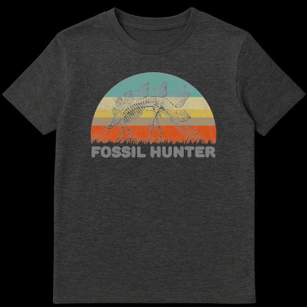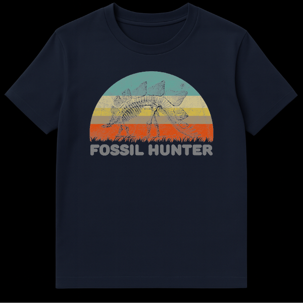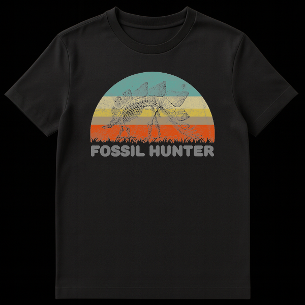 Unearth a classic look with our Fossil Hunter Stegosaurus T-Shirt. This design is a tribute to the golden age of dinosaur discovery, featuring a scientifically styled Stegosaurus skeleton silhouette set against a distressed, retro-striped sunset in teal, mustard, and rust. The bold “FOSSIL HUNTER” typography anchors the graphic, making it a standout piece for rock hounds and dino nerds alike. Whether you are heading to a museum, going on a geological dig, or just love the vintage grunge aesthetic, this shirt captures the spirit of exploration. It is the perfect present for boys, girls, geology students, and adults who never outgrew their dinosaur phase.
