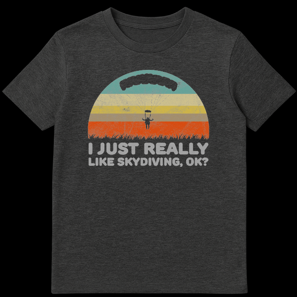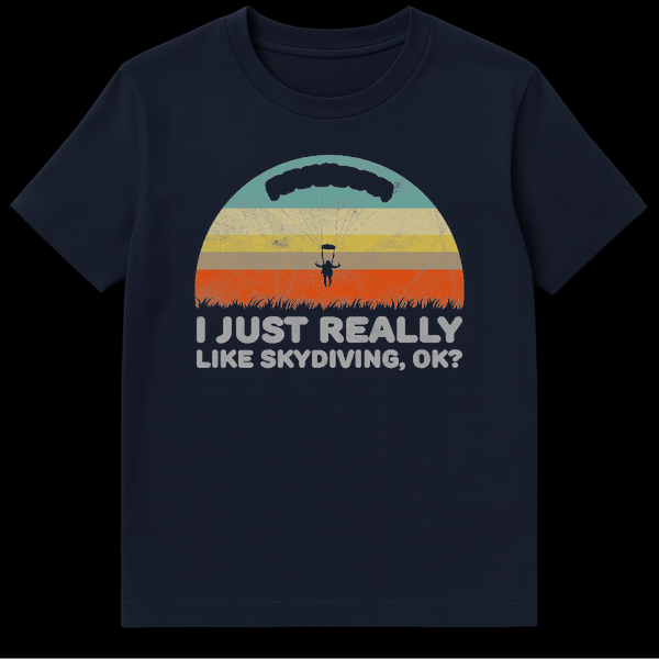 Celebrate your free-falling obsession with this vintage-inspired skydiving design. Featuring a classic distressed retro sunset and a parachutist silhouette, it perfectly captures the thrill of the jump. The humorous text “I Just Really Like Skydiving, Ok?” makes this the ideal gift for adrenaline junkies who can’t stop talking about their next dive.