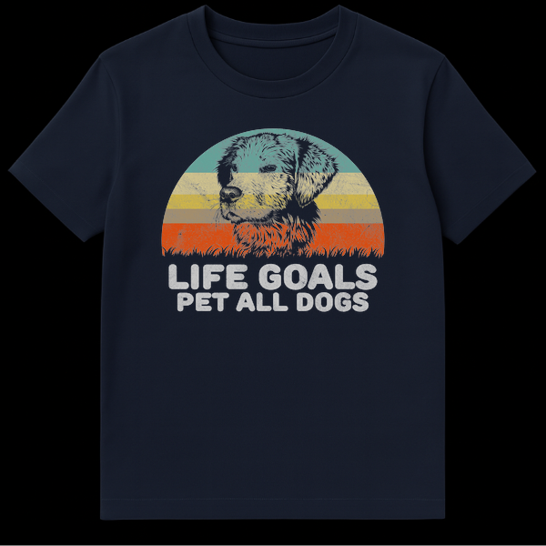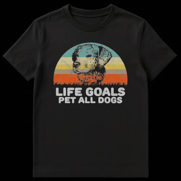 Celebrate your ultimate canine ambitions with this charming vintage-inspired design featuring a classic Golden Retriever against a retro striped sunset. The humorous slogan ‘Life Goals: Pet All Dogs’ perfectly captures the heart of every dedicated dog lover. With its distressed, weathered texture, this tee adds a cool, nostalgic vibe to any casual outfit, making it the perfect gift for dog moms and dads.