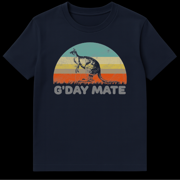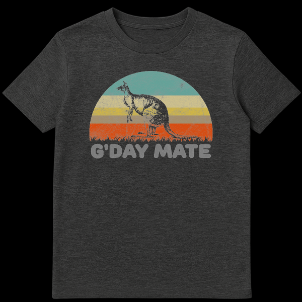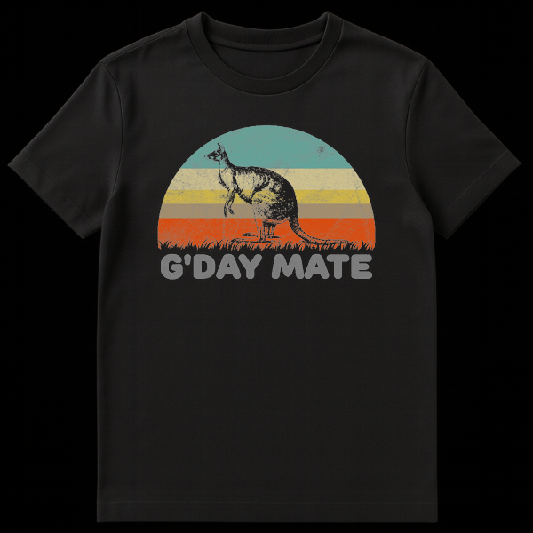 Embrace the Aussie spirit with this vintage-inspired G’Day Mate kangaroo t-shirt. Featuring a classic 70s retro sunset in warm earth tones behind a detailed kangaroo sketch, this design captures the laid-back vibe of the Outback. It makes the perfect gift for Australian expats, travelers, or anyone who loves unique animal graphic tees.