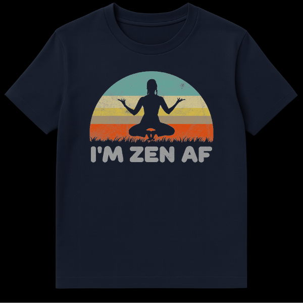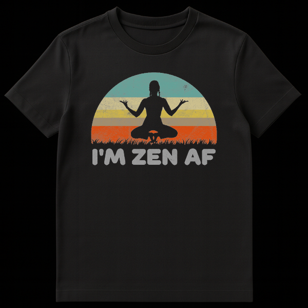 Embrace the ultimate state of relaxation with our ‘I’m Zen AF’ t-shirt, a perfect blend of retro style and modern attitude. This design features a classic vintage sunset aesthetic in stripes of teal, beige, yellow, and burnt orange, all finished with a cool, distressed grunge texture for that worn-in look. At the center sits a meditating figure in a lotus pose, perfectly grounded above a silhouette of grass. The bold, blocky text adds a hilarious twist, proving that you can be spiritually enlightened and still have a sense of humor. Whether you are a yoga instructor, a meditation practitioner, or just someone who values their chill time, this shirt is a conversation starter. It makes an excellent gift for yogis, hippies, or anyone who needs a reminder to breathe deep and stay calm.