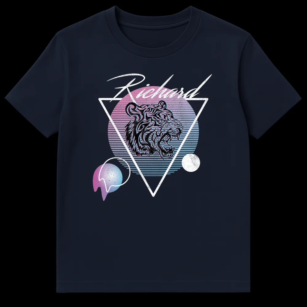 Embrace 80s nostalgia with this striking Synthwave tiger design, personalized with the name Richard. Featuring a roaring tiger, vibrant neon gradient sunset, and classic scan line effects, it’s a bold statement for anyone named Richard who loves retro-futuristic aesthetics and unique graphic tees. Perfect for the Richard in your life who appreciates vintage cool.