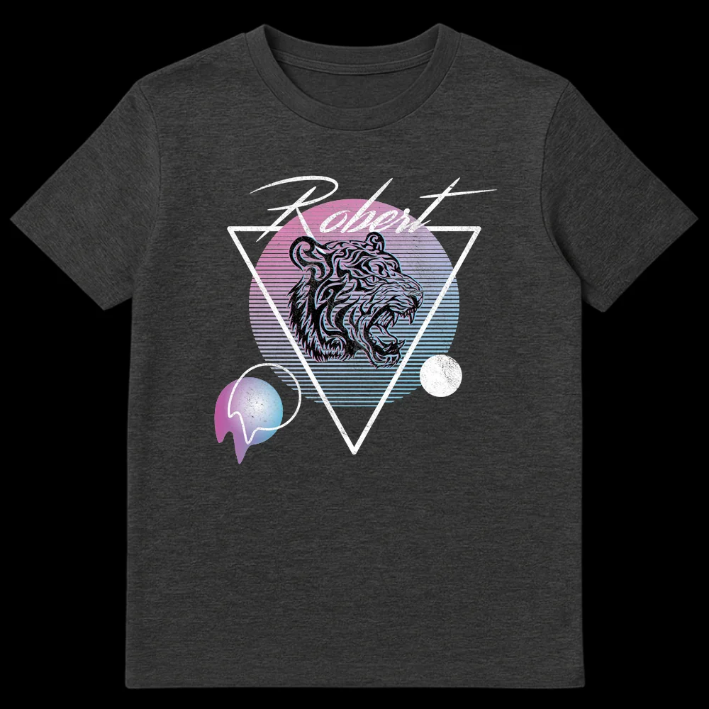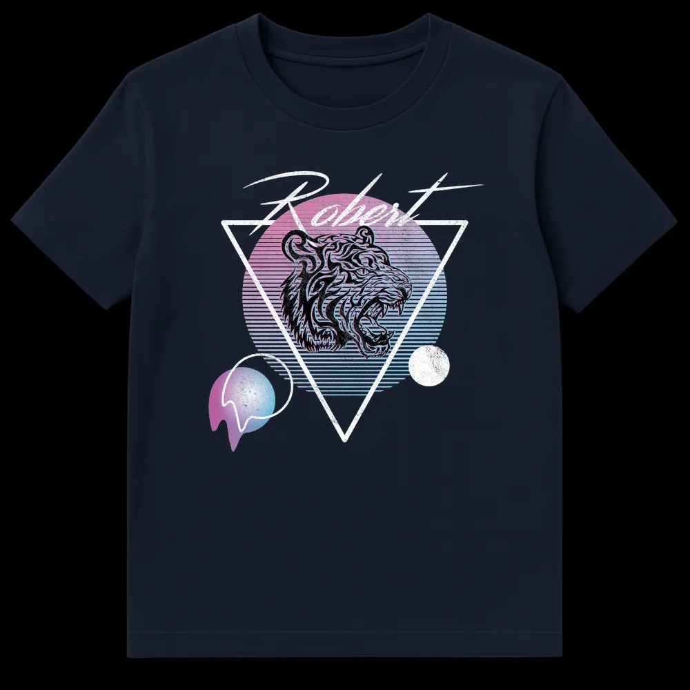Step back into the future with our “Robert” personalized t-shirt, a head-turning design that perfectly blends a fierce tiger motif with the iconic Synthwave/Vaporwave aesthetic of the 1980s and early 1990s. The stylized tiger head, baring fangs, is a symbol of strength and individuality, set against a backdrop of bold geometric shapes and a mesmerizing neon gradient sunset. You’ll love the subtle distressed textures and the eye-catching anaglyph 3D effect on the tiger, giving it that authentic retro digital vibe. This tee isn’t just clothing; it’s a wearable piece of art that pays homage to a vibrant cultural era. It’s an ideal choice for any Robert who wants to showcase their strong personality, appreciate unique retro styles, or simply loves a design that stands out. Give the gift of personalized cool to a friend or family member named Robert, or treat yourself to this nostalgic and powerful statement piece.