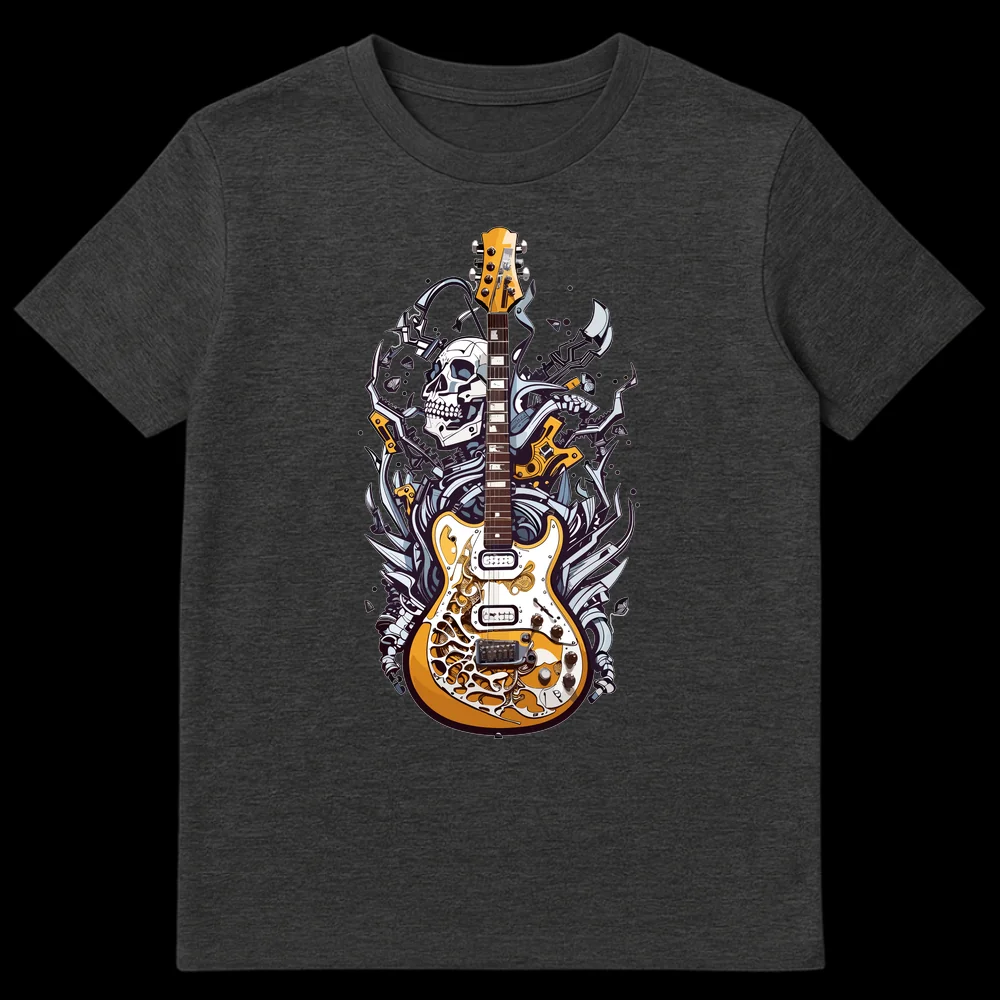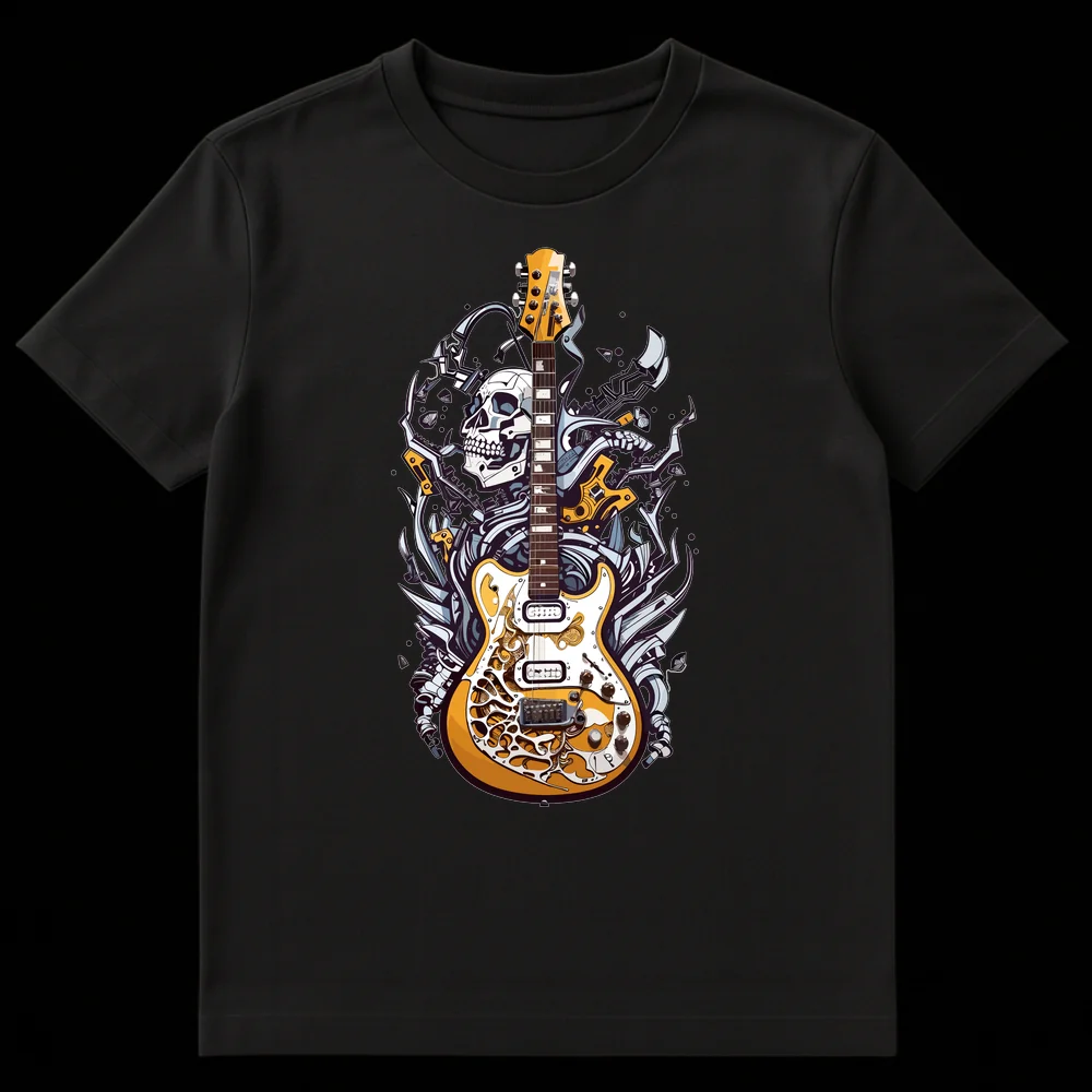Unleash your inner rocker with this striking t-shirt featuring a detailed electric guitar intertwined with a human skull and biomechanical elements. This powerful design embodies the raw energy and passion of heavy metal culture, making a bold statement. Perfect for guitarists, rock music enthusiasts, or anyone who loves edgy, alternative fashion.