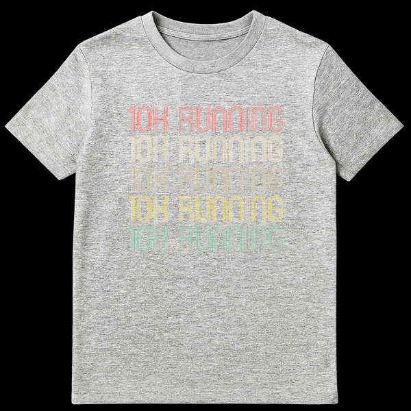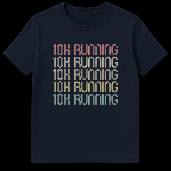 Embrace your dedication to the road with our ’10K RUNNING’ t-shirt, an ode to every runner’s focus and passion. This design isn’t just a shirt; it’s a mantra, featuring the phrase repeated five times in a striking, retro 70s/80s aesthetic. The unique multi-line, ‘groovy’ typeface with a subtle distressed texture gives it an authentic vintage feel, as if pulled straight from a classic athletic event. A gradient of muted, earthy tones—from reddish-orange to teal—adds to the nostalgic charm, set against a versatile black background. Perfect for showing pride in your running achievements or motivating yourself for the next 10K race. This tee makes an excellent gift for any runner, fitness enthusiast, or anyone who loves the blend of active lifestyle and classic style.