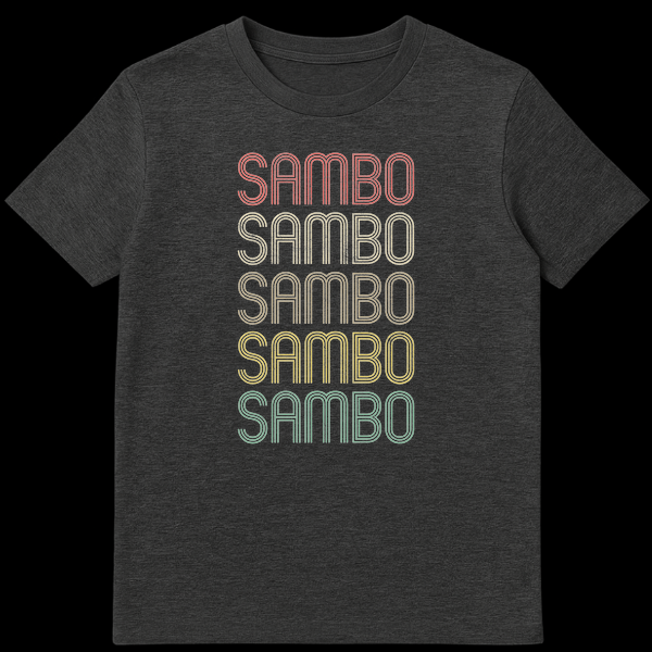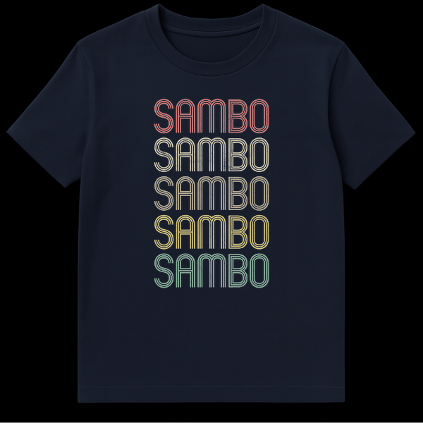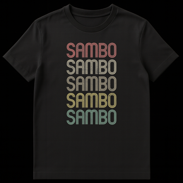 Embrace the spirit of Sambo with this distinctive and stylish t-shirt, celebrating the powerful Soviet martial art. The design prominently features the word “SAMBO” repeated five times, showcasing a unique retro typographic style reminiscent of 60s, 70s, and 80s aesthetics. Each letter boasts a multi-line, outlined appearance with a carefully applied distressed texture, giving it an authentic vintage, worn-in feel. The desaturated rainbow gradient — from salmon to teal — against a bold black background makes the design pop, ensuring you stand out. This shirt is more than just apparel; it’s a statement of identity and passion for the sport, or a personalized item for anyone named Sambo. It makes an excellent gift for martial arts enthusiasts, Sambo practitioners, coaches, or anyone who loves unique vintage-style athletic wear.