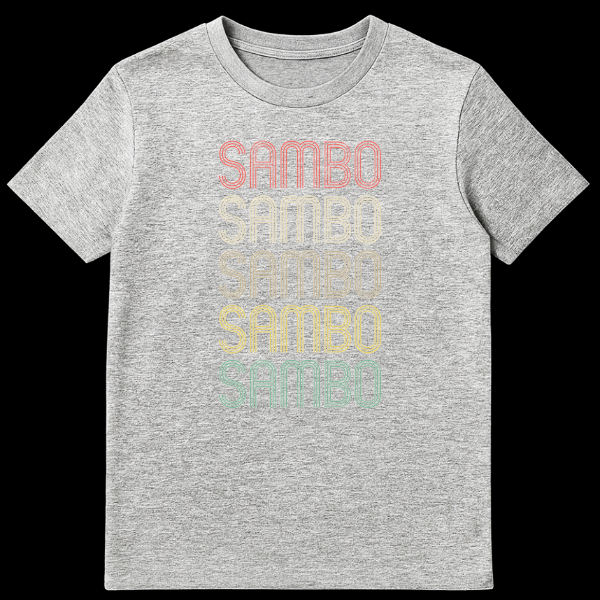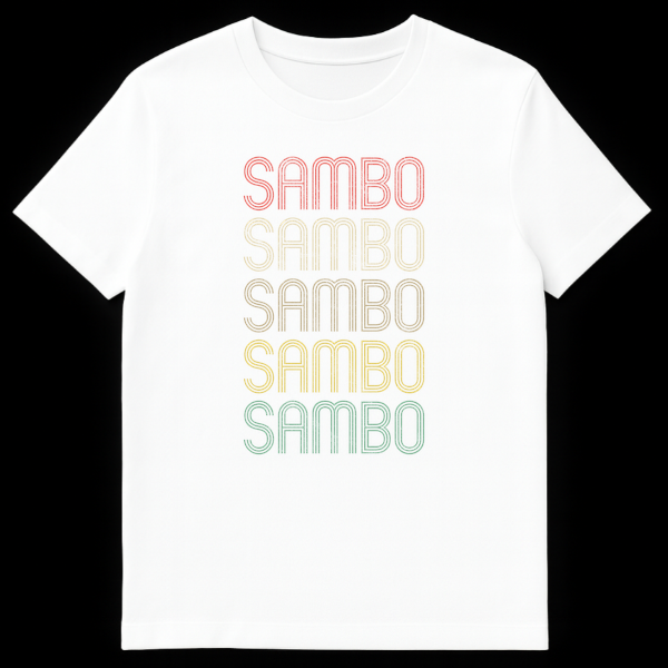 Show your passion for the Sambo martial art with this striking vintage-inspired t-shirt. Featuring the word “SAMBO” stacked five times in a distressed, groovy retro font with a desaturated rainbow gradient, this design instantly evokes classic athletic style. It’s a perfect gift for Sambo practitioners, fans, or anyone who appreciates unique combat sports apparel.