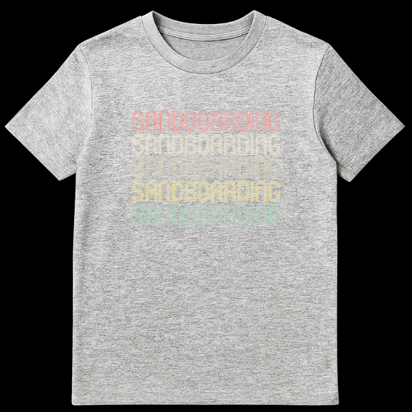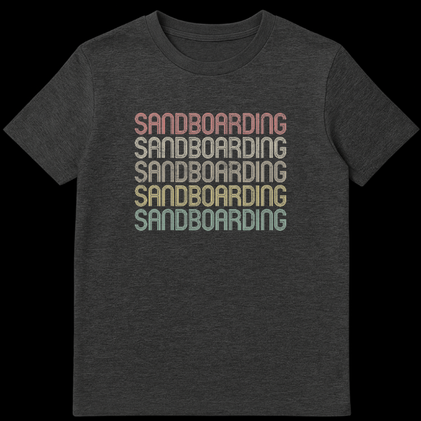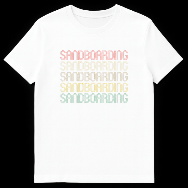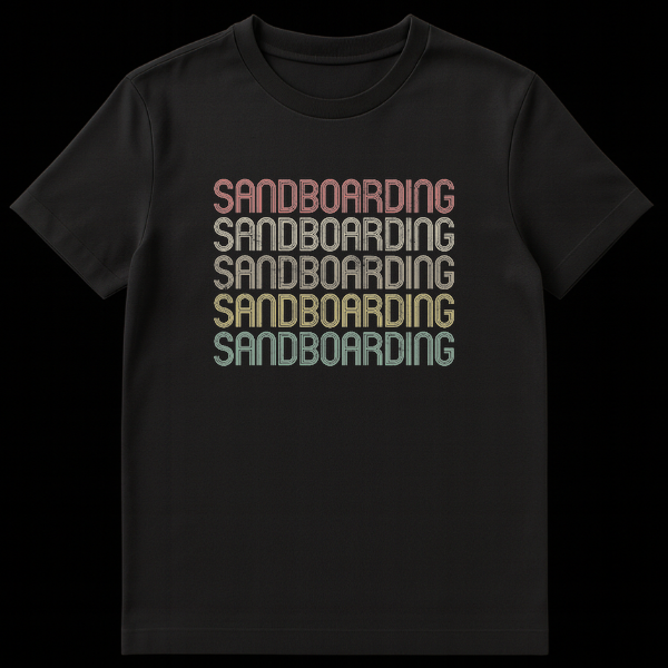 Embrace the thrill of the dunes with our unique “SANDBOARDING” t-shirt, a must-have for every adventurer and retro style aficionado. The design powerfully repeats the word “SANDBOARDING” five times, creating a bold, stacked typography statement. Each line boasts a distressed, multi-lined block font with an inline effect, giving it a cool, layered depth and a vintage-worn feel. The standout feature is the desaturated, earthy gradient color palette, subtly shifting from a muted reddish-pink at the top through terracotta, faded gold, and light olive green, down to a dusty mint green at the bottom, all set against a classic black background. This specific color scheme and aged texture evoke a strong 70s or 80s aesthetic, making it a stylish nod to the past while celebrating a modern extreme sport. It’s an ideal gift for sandboarding enthusiasts, thrill-seekers, travelers who explore desert landscapes, or anyone with an appreciation for unique board sports and vintage-inspired apparel. Wear your passion and identify with the sandboarding community in effortlessly casual style.
