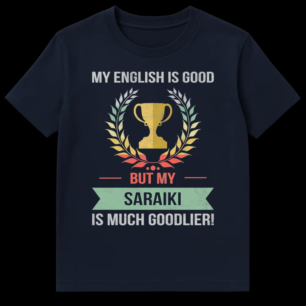 Celebrate your Saraiki heritage with this witty tee featuring a trophy graphic and the phrase “MY ENGLISH IS GOOD BUT MY SARAIKI IS MUCH GOODLIER!”. This design playfully embraces cultural pride through a humorous linguistic pun, making it a perfect conversation starter. Ideal for Saraiki speakers, cultural enthusiasts, or anyone proud of their mother tongue.