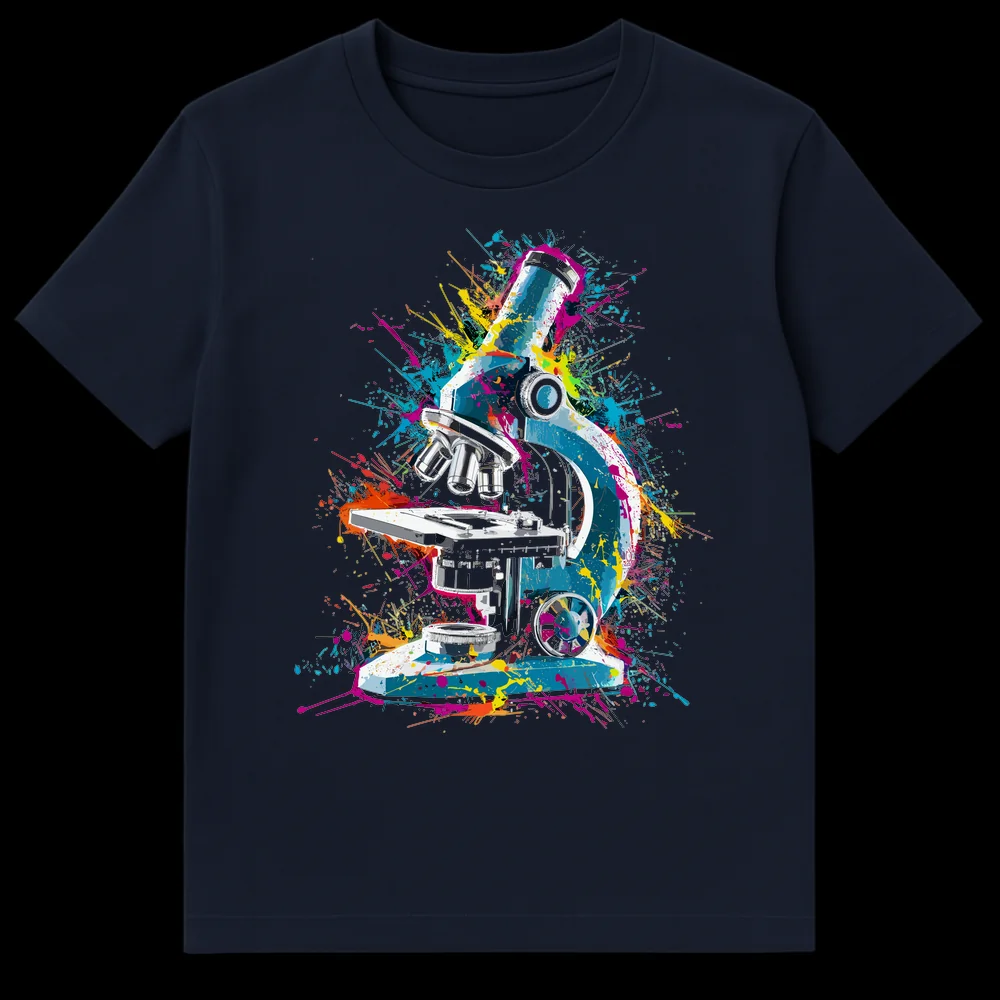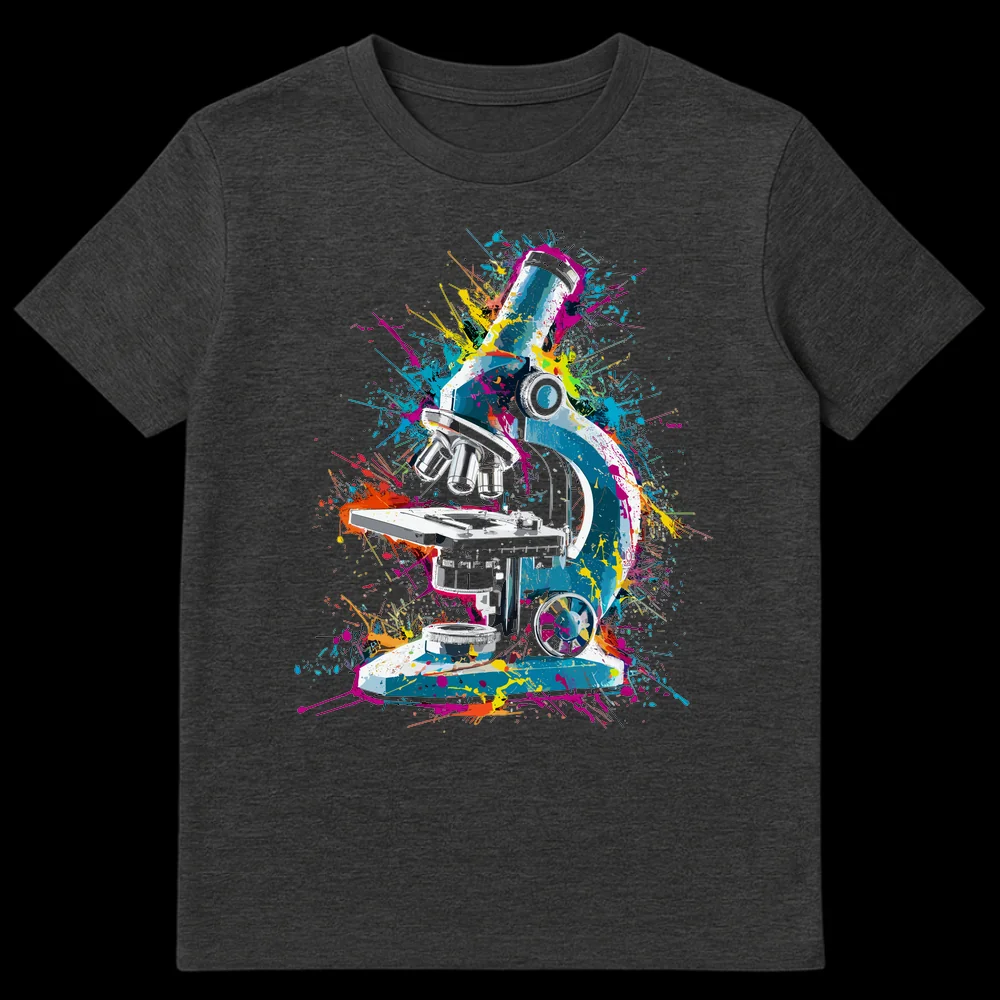 Explore the vibrant intersection of art and science with this unique t-shirt. Featuring a detailed compound microscope enveloped in energetic, multi-chromatic paint splatters, it celebrates the creativity and wonder of scientific discovery. A perfect gift for biologists, chemists, students, educators, or anyone passionate about STEM fields.