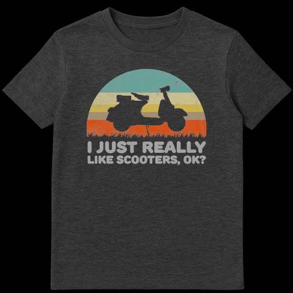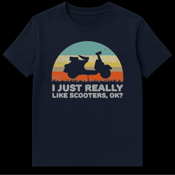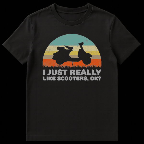 Declare your simple affection with the ‘I JUST REALLY LIKE SCOOTERS, OK?’ t-shirt. This design features a classic scooter silhouette cruising across a retro sunset landscape, complete with vibrant stripes and tall grass. It perfectly captures that nostalgic feeling and casual passion for scooters. An ideal gift for any scooter owner or enthusiast who unapologetically loves their ride.