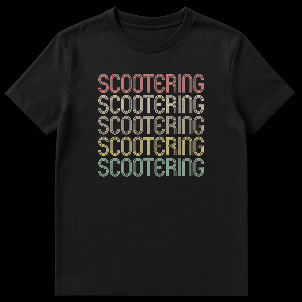 Declare your passion with our “SCOOTERING” repetitive text tee, featuring a bold vintage typography style. Each line boasts a unique distressed texture and a retro rainbow color gradient, celebrating your love for scootering in an understated yet striking way. It’s the perfect gift for any scooter rider, enthusiast, or anyone who lives for the ride.