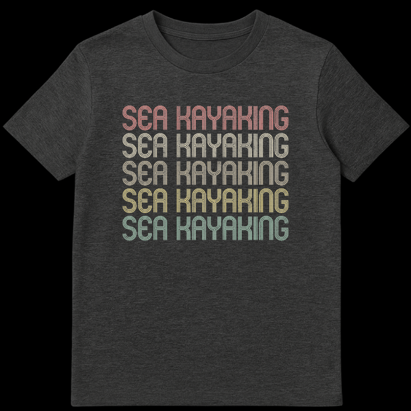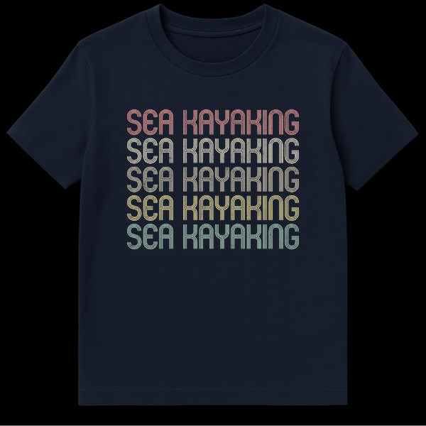 Embrace your love for the waves and the paddle with this distinctive “SEA KAYAKING” t-shirt, a true nod to the dedicated enthusiast. The design features the phrase “SEA KAYAKING” repeated five times in a striking vertical stack, creating a powerful visual chant of your favorite activity. Its unique retro 70s/80s typographic style, enhanced by a distressed texture and a sequential gradient of muted, warm colors, evokes a timeless, vintage vibe that sets it apart. This shirt is more than just apparel; it’s a badge of honor for those who find peace and adventure on the water. It’s an ideal gift for passionate sea kayakers, paddling enthusiasts, or anyone who appreciates a classic, activity-specific design with a nostalgic feel. Show off your pride and connect with fellow adventurers.