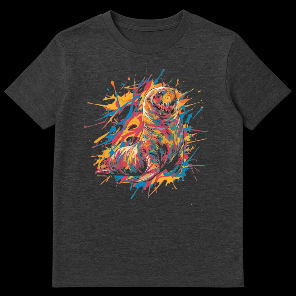 Dive into dynamic style with this eye-catching Sea Lion t-shirt, a true celebration of marine life through art. The design showcases a charismatic sea lion, rendered in a captivating pop art, graffiti-inspired illustration style, bursting with vibrant hues against a deep black background. Its open-mouthed expression and the surrounding explosion of abstract paint splatters convey pure joy and energy, making it an uplifting statement piece. The subtle ‘Gerry Pure ’17’ detail adds an intriguing layer, possibly referencing a special year or dedication. This shirt is more than just clothing; it’s a wearable piece of modern art, perfect for anyone aged 15-45 who adores ocean conservation, wildlife, or contemporary illustration. Gift it to an animal lover, a pop art enthusiast, or anyone looking to inject a splash of color and personality into their wardrobe.