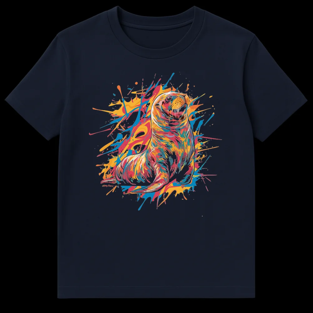 Embrace the wild with our vibrant Sea Lion t-shirt, featuring an energetic, multi-color sea lion in a pop art, graffiti-inspired style. Surrounded by a dynamic burst of abstract paint splatters, this design captures the joyful spirit of marine life. The ‘Gerry Pure ’17’ text adds a unique, possibly commemorative, touch. It’s a perfect gift for marine animal enthusiasts and art lovers who appreciate bold, expressive apparel.