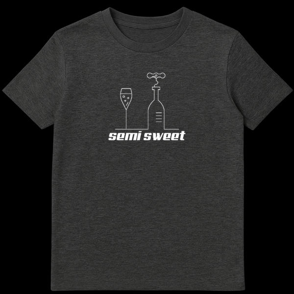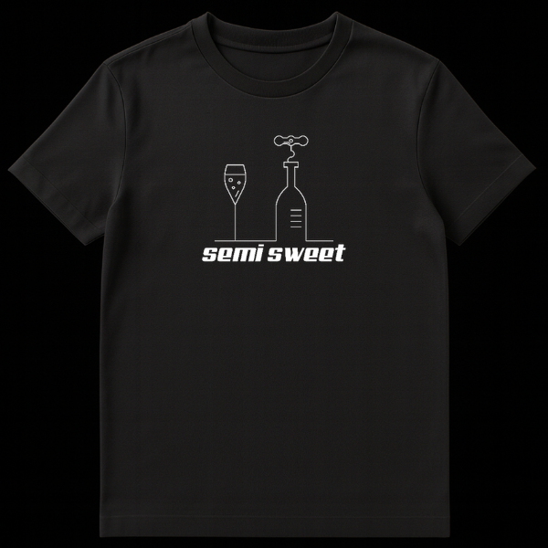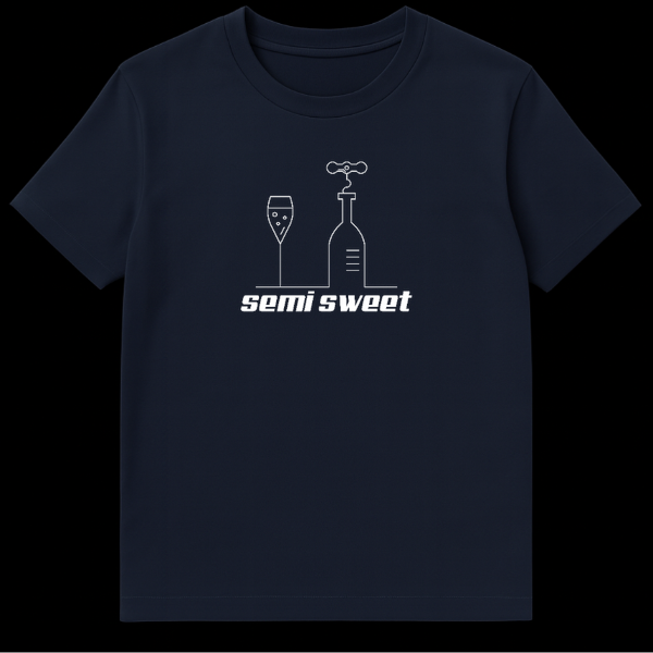 Celebrate the lighter side of life with this elegant ‘Semi Sweet’ wine graphic tee. Featuring minimalist white line art of a sparkling champagne flute and a bottle ready to pop, this design perfectly captures the joy of a good pour. It is an ideal gift for sommeliers, wine tasting enthusiasts, or anyone who prefers their vino with a touch of sweetness.