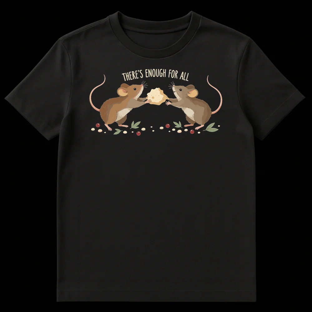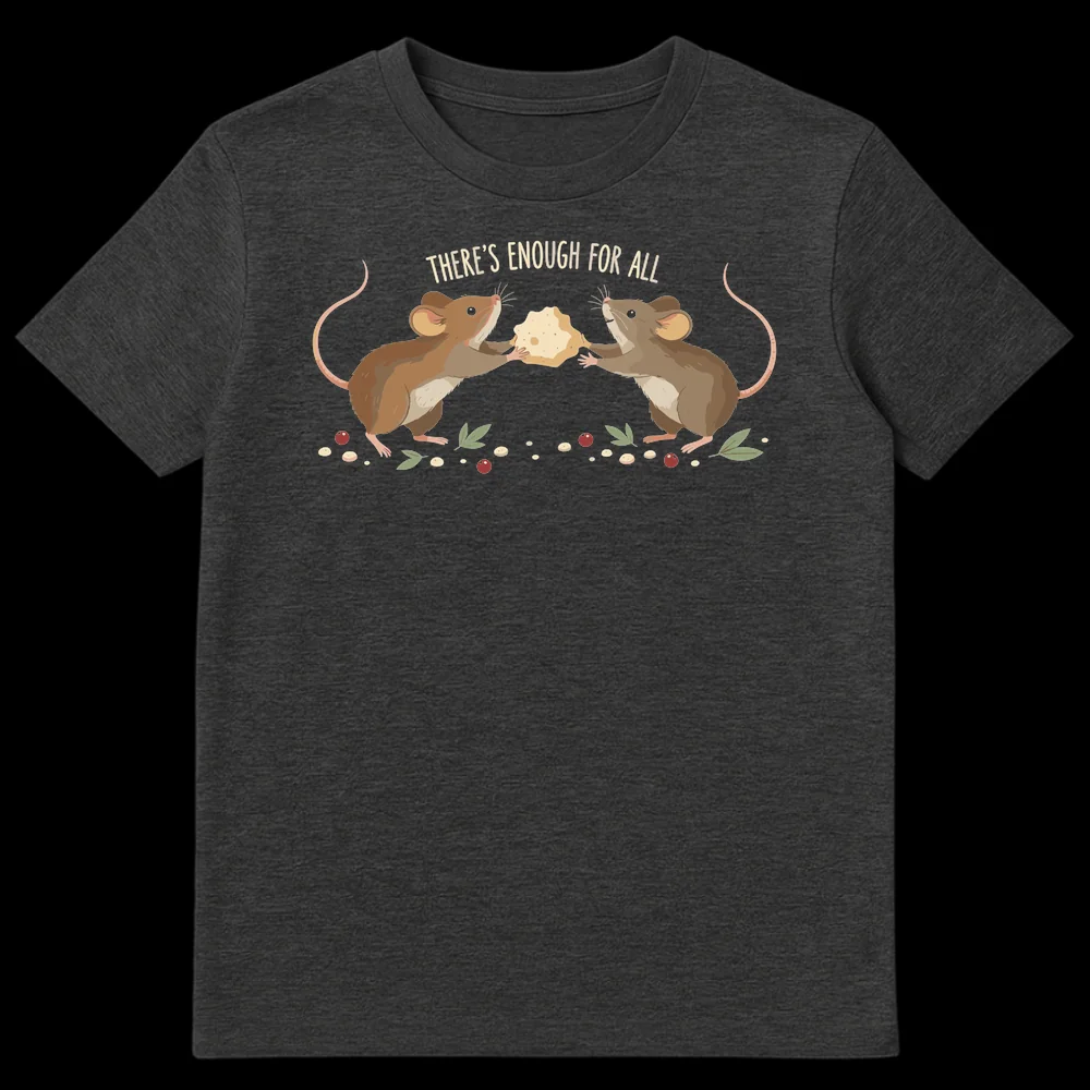 Embrace a heartwarming message with this adorable t-shirt featuring two friendly mice collaboratively sharing a large piece of cheese, surrounded by nature’s bounty. The uplifting text “THERE’S ENOUGH FOR ALL” promotes generosity and community, making it a perfect gift for animal lovers, advocates for kindness, or anyone who cherishes positive affirmations. Its charming, illustrative cartoon style with a hand-drawn feel adds a whimsical touch to any wardrobe.