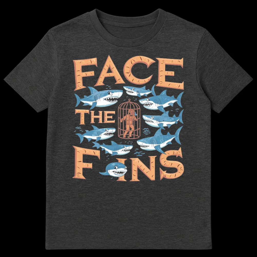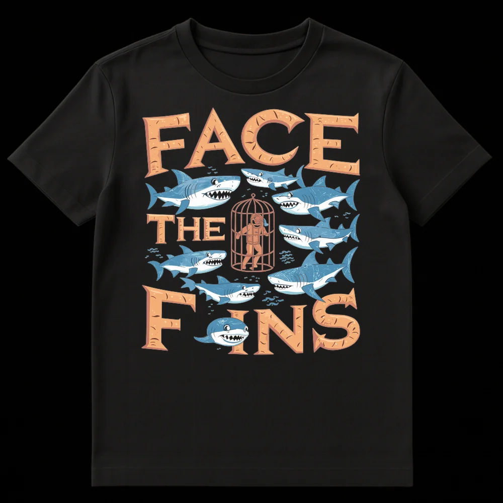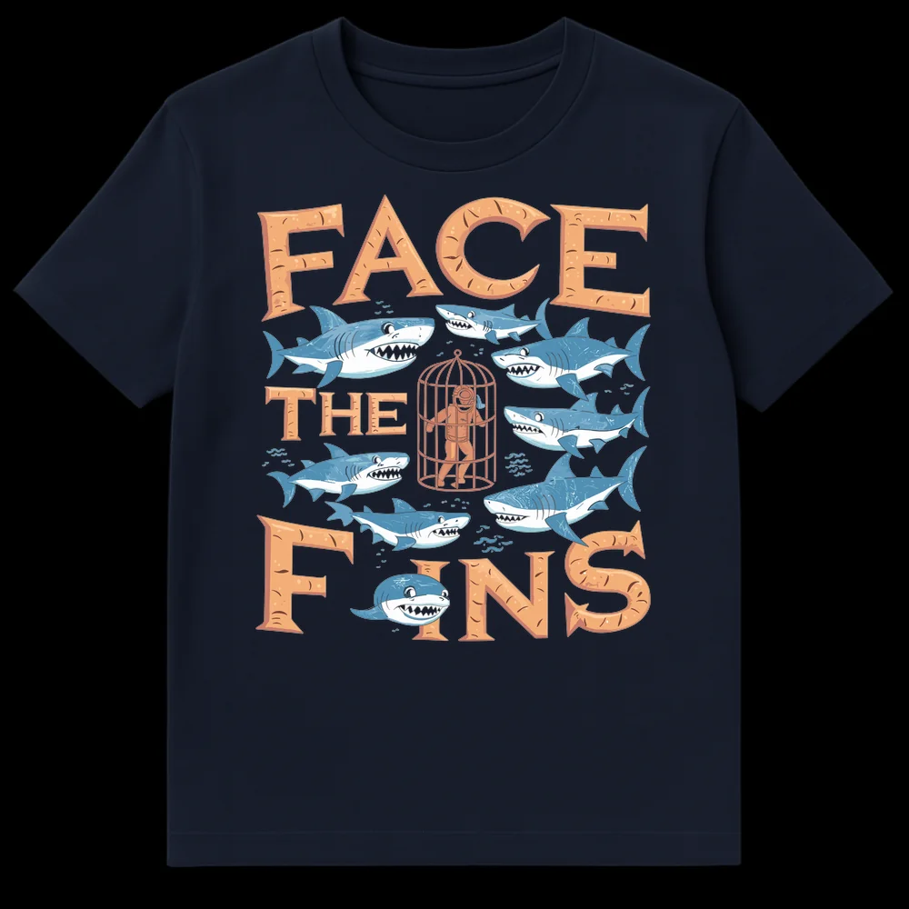Dive into humor with our “FACE THE FINS” t-shirt, a clever pun on ‘face the music’ featuring a calm diver in a cage surrounded by friendly cartoon sharks. This whimsical design is perfect for marine life lovers and anyone who appreciates a good dad joke or unique ocean-themed humor. It makes an ideal gift for shark enthusiasts, pun lovers, or coastal dwellers looking for a conversation-starting tee.