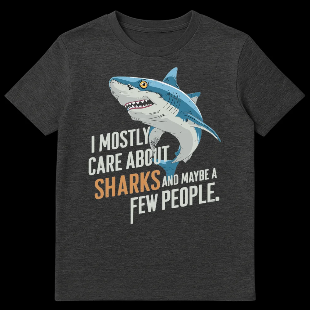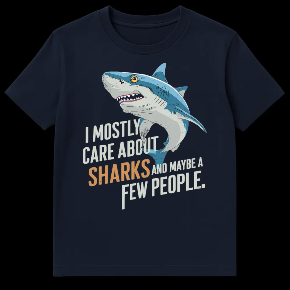 Express your unique personality with this humorous shark t-shirt. Featuring a bold cartoon shark and the witty phrase “I MOSTLY CARE ABOUT SHARKS AND MAYBE A FEW PEOPLE,” it’s perfect for anyone who loves marine life more than social small talk. This design is an ideal gift for shark enthusiasts, introverts, or ocean conservationists.