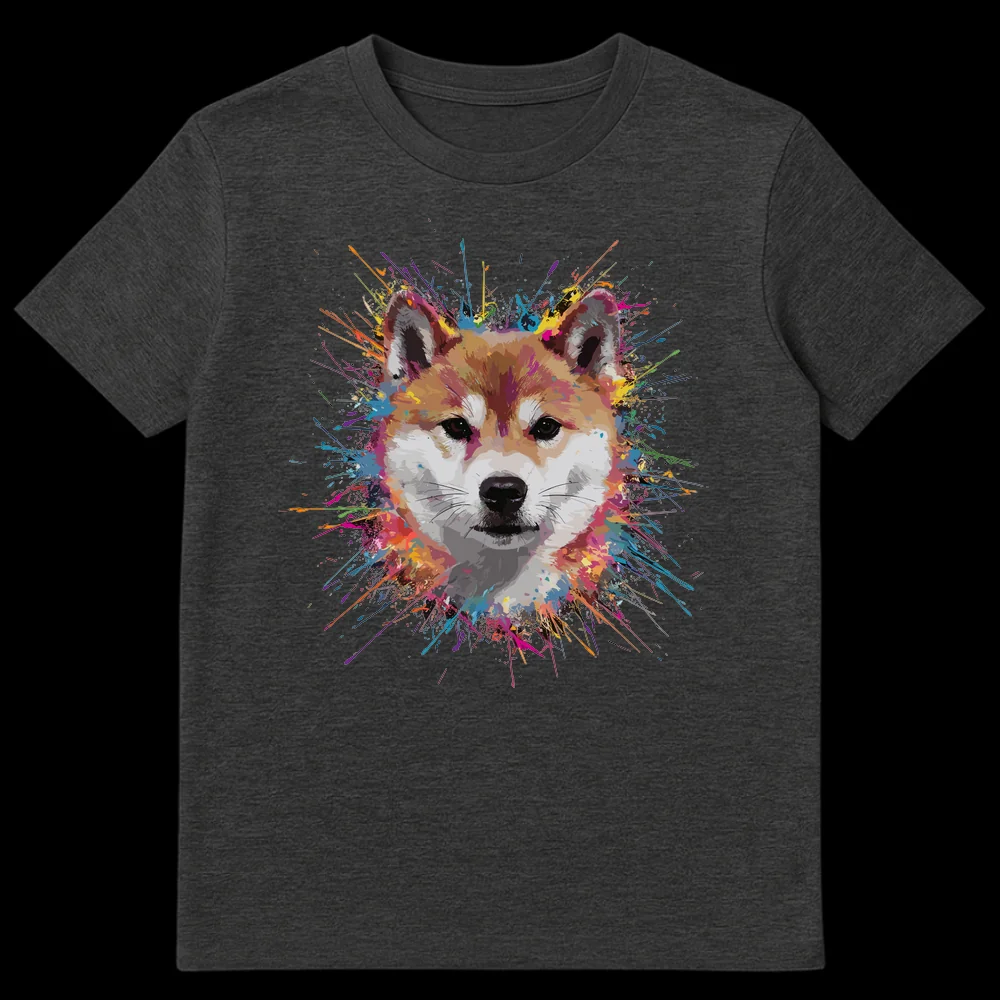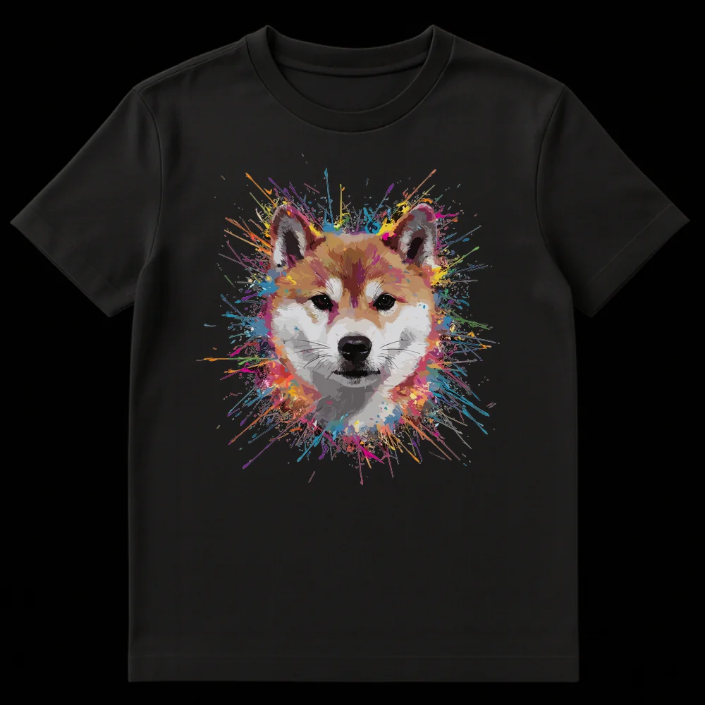 Celebrate your love for the iconic Shiba Inu with this dynamic t-shirt. Featuring a stylized Shiba Inu head surrounded by an explosion of vibrant, multi-color paint splatters, this design captures the energetic spirit of the beloved breed. It’s a striking and modern piece for any dog enthusiast who appreciates bold, artistic animal imagery. Makes a perfect gift for Shiba Inu owners and dog lovers alike.