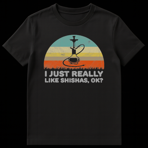 Declare your passion with our ‘I JUST REALLY LIKE SHISHAS, OK?’ t-shirt. This design features a bold hookah silhouette against a retro-striped sunset backdrop, merging a vintage aesthetic with a modern, humorous confession. It’s the perfect gift for anyone who enjoys a relaxing shisha session and isn’t afraid to show it.