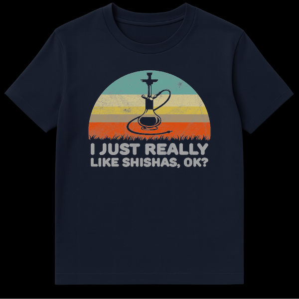 Make a clear statement without saying a word, unless someone asks about your awesome t-shirt! Our ‘I JUST REALLY LIKE SHISHAS, OK?’ tee brilliantly combines a laid-back, humorous declaration with a stylish, vintage-inspired design. The central black hookah silhouette stands out against a faded semi-circle of retro teal, yellow, brown, and orange stripes, evoking a warm, chill vibe. Below, subtle grass-like silhouettes add a touch of natural grounding. The distressed white text ensures your love for shisha is broadcast loud and clear, in a cool, casual manner. It’s an ideal conversation starter and a perfect gift for any shisha connoisseur, hookah lounge regular, or anyone who appreciates the unique culture surrounding shisha smoking. This shirt isn’t just clothing; it’s a wearable nod to your favorite pastime, wrapped in a cool aesthetic.