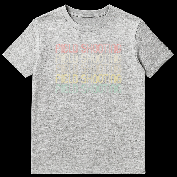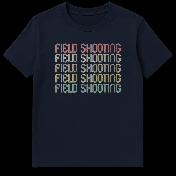 Showcase your dedication to the sport with our distinctive ‘FIELD SHOOTING’ t-shirt. This eye-catching apparel celebrates the spirit of marksmanship, featuring the iconic phrase five times, stacked in a striking vertical arrangement. Each repetition boasts a unique color, transitioning from a warm reddish-orange to a cool teal, creating an appealing gradient. The bold, sans-serif inline font gives a cool retro vibe, further enhanced by a subtle distressed texture that mimics faded paint or worn print. Set against a deep black background, the vibrant text truly pops, making this shirt a stylish and impactful piece. It’s an ideal choice for range days, outdoor adventures, or simply expressing your love for shooting sports. This shirt makes an excellent present for any shooter, gun owner, hunter, or marksmanship enthusiast looking for unique and meaningful shooting apparel.