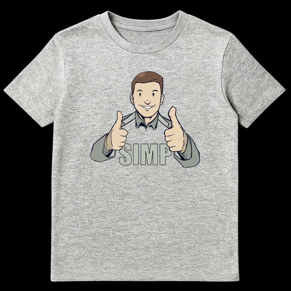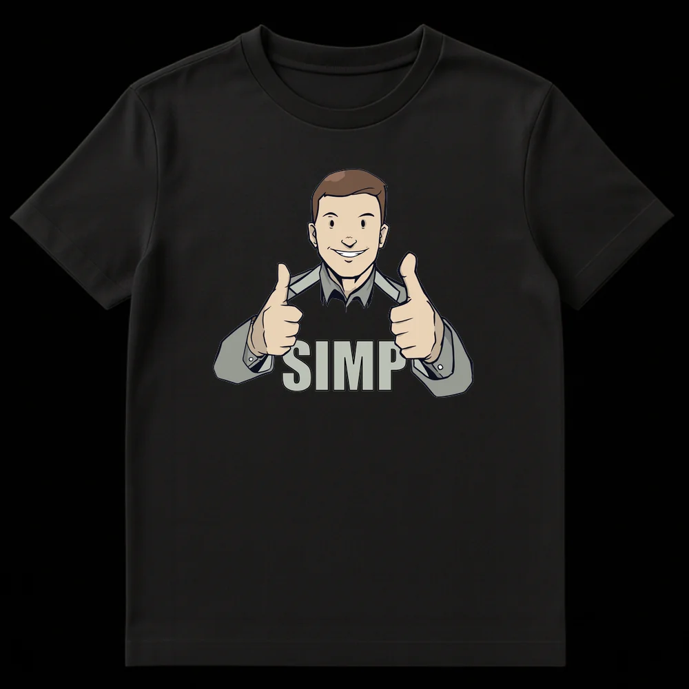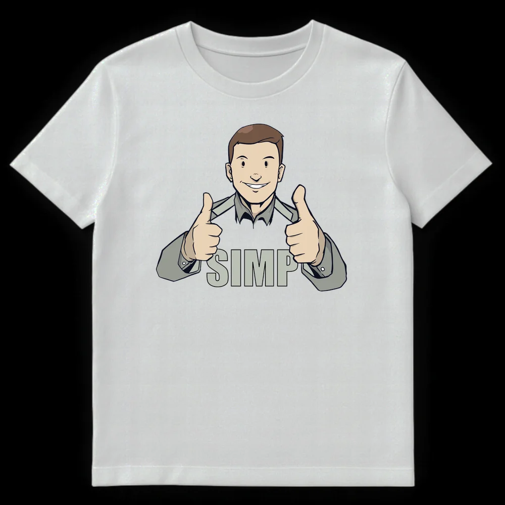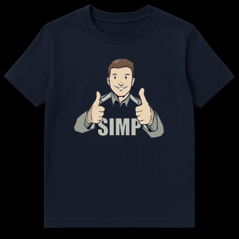 Dive headfirst into the hilarious world of internet culture with this unique “SIMP” t-shirt. The design showcases a friendly, cartoon character giving an enthusiastic double thumbs-up, a universally positive gesture, which creates a brilliant ironic contrast with the bold “SIMP” text across his chest. This popular internet slang, widely known in streaming, TikTok, and gaming communities, refers to someone overly eager to please online. Our t-shirt turns this often-pejorative term into a funny, self-aware badge of honor, celebrating modern digital humor. It’s ideal for young adults (18-35) who live and breathe online trends and enjoy a good self-deprecating joke. Whether you’re a streamer, a meme lord, or just someone who loves unique, culturally relevant apparel, this shirt is designed to spark smiles and knowing nods. Crafted for comfort and style, it’s the ultimate gift for friends who appreciate ironic humor, online slang, and want to show off their internet savvy.