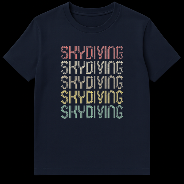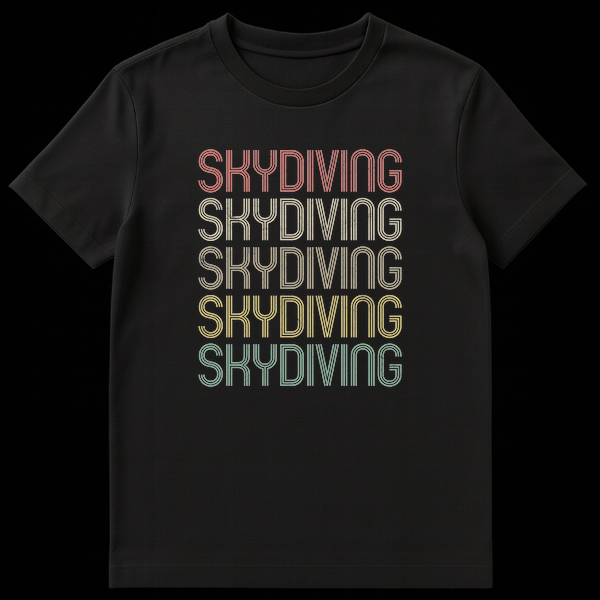 Declare your love for the skies with our eye-catching Retro Skydiving Typography T-shirt. This unique design prominently features the word ‘SKYDIVING’ repeated five times, rendered in a distinctive outline, multi-line sans-serif font with a cool distressed texture. The vintage-inspired gradient of muted coral, beige, olive, mustard, and teal hues against a solid black background evokes a nostalgic 70s-80s aesthetic, perfect for those who appreciate classic style. This shirt isn’t just clothing; it’s a statement of identity, passion, and belonging within the skydiving community. Ideal for skydivers, adventure sports enthusiasts, or anyone seeking a stylish, authentic way to express their love for the sport, it makes an excellent gift for birthdays, holidays, or commemorating a first jump. Show off your adventurous spirit and timeless style!