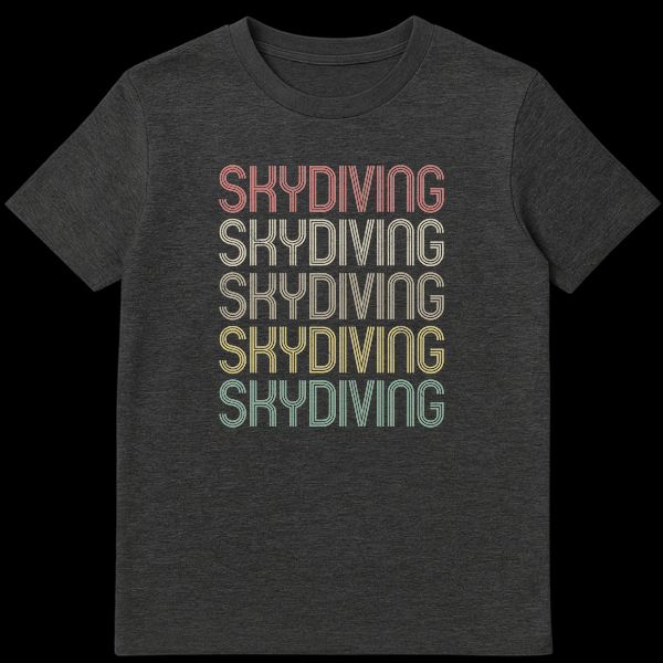 Embrace your passion with our Retro Skydiving Typography T-shirt, featuring the word ‘SKYDIVING’ repeated in a vintage-inspired, distressed multi-line font. This design celebrates the thrill of freefall with a cool 70s-80s aesthetic and a muted gradient color palette. It’s the perfect gift for any skydiver, adventure sports fan, or anyone who loves a unique retro graphic tee.