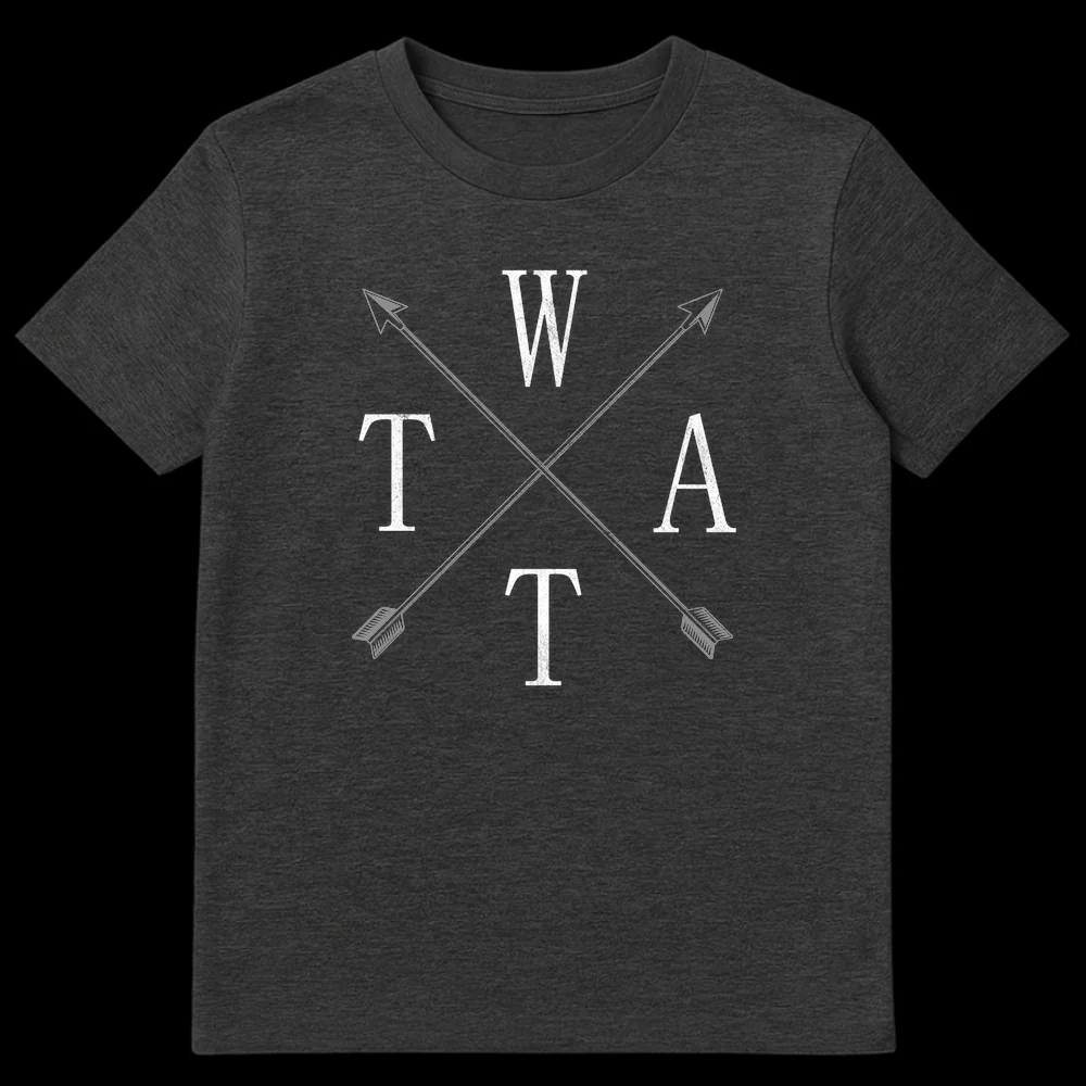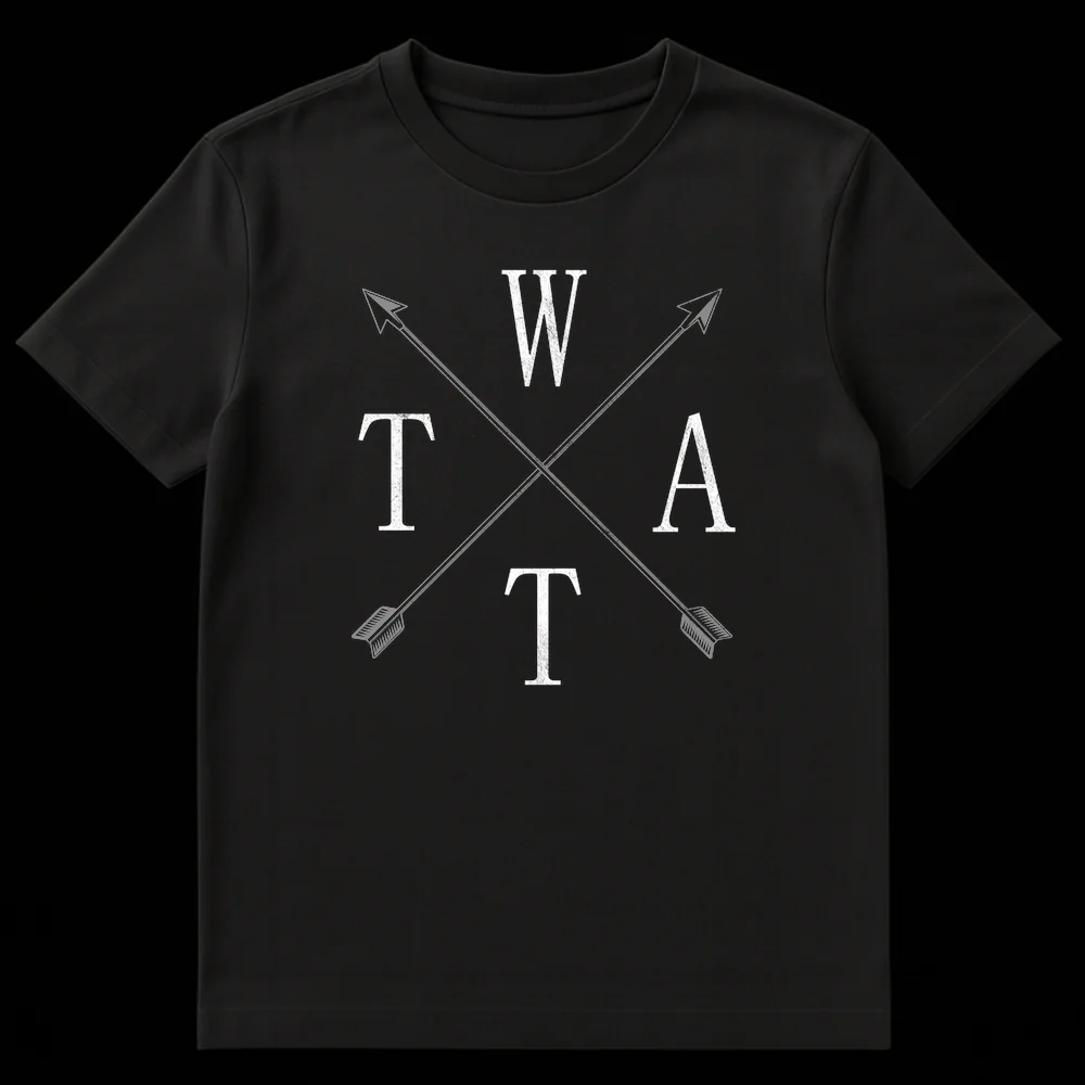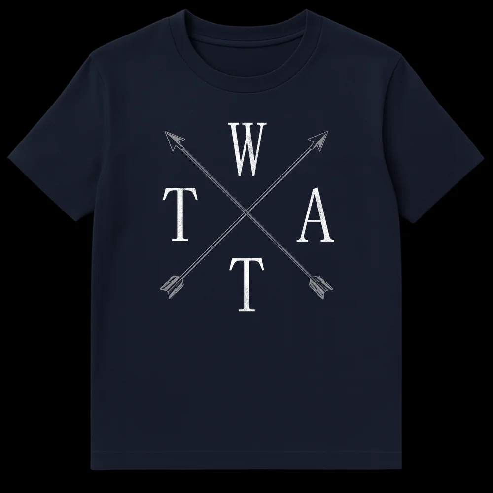 Unleash a knowing smirk with this subtly subversive t-shirt featuring the letters W, T, A, T artfully arranged around rustic crossed arrows. This design ingeniously spells out a cheeky British slang term for those in the know, offering a clever visual pun that’s both ironic and amusing. It’s perfect for adults who appreciate dark humor, unique wordplay, and a touch of rebellious style. A fantastic gift for friends who love a good inside joke and aren’t afraid to wear their wit.