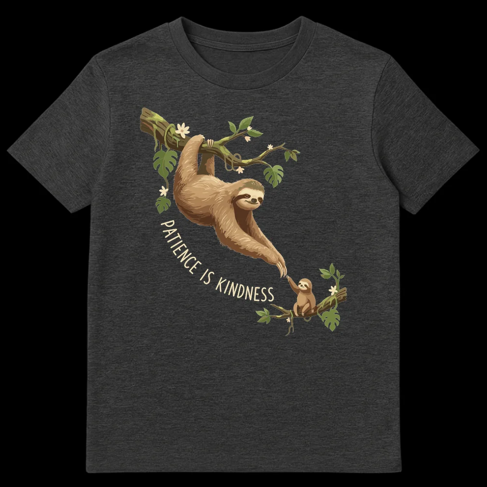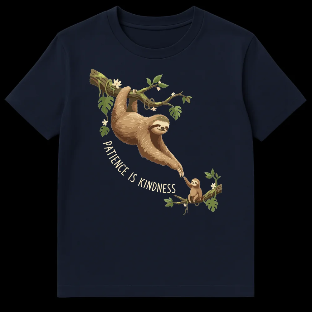 Discover your new favorite tee with our charming Sloth Lover T-Shirt, a perfect blend of warmth and inspiration. This design showcases two endearing sloths amidst vibrant jungle foliage, with an adult sloth gently reaching towards a curious baby sloth. The phrase “PATIENCE IS KINDNESS” elegantly arcs below them, embodying the peaceful and caring essence of the sloths and the message itself. It’s more than just a t-shirt; it’s a wearable affirmation that promotes a mindful and gentle approach to life. The modern vector illustration style, with its earthy color palette, makes the sloths and their lush environment truly pop against the dark background. This tee is an ideal gift for animal enthusiasts, mindful living advocates, parents, caregivers, or anyone who appreciates a positive and uplifting message. Wear it as a daily reminder or give it to a loved one to spread warmth, tenderness, and inspiration.