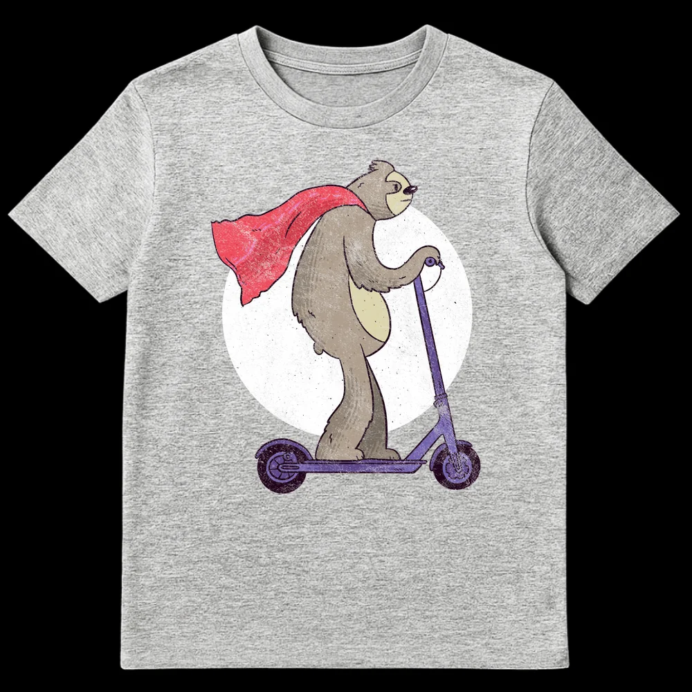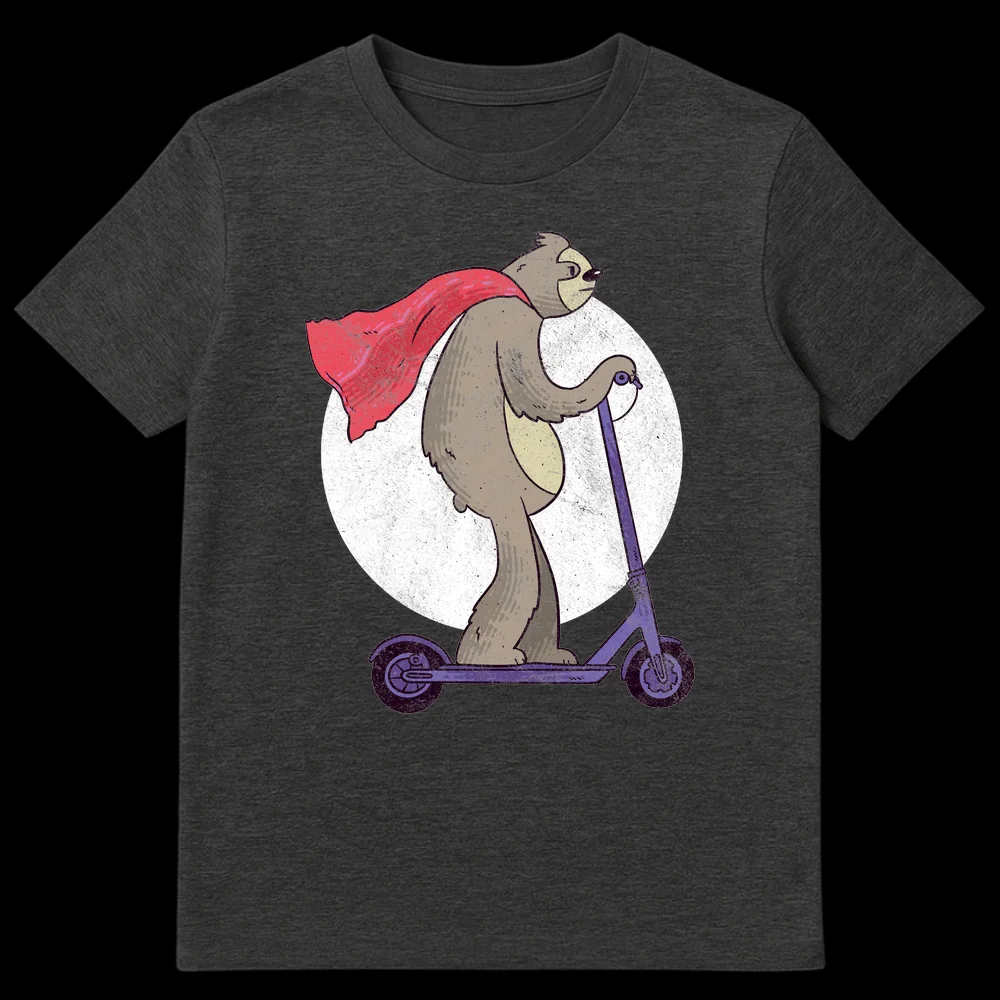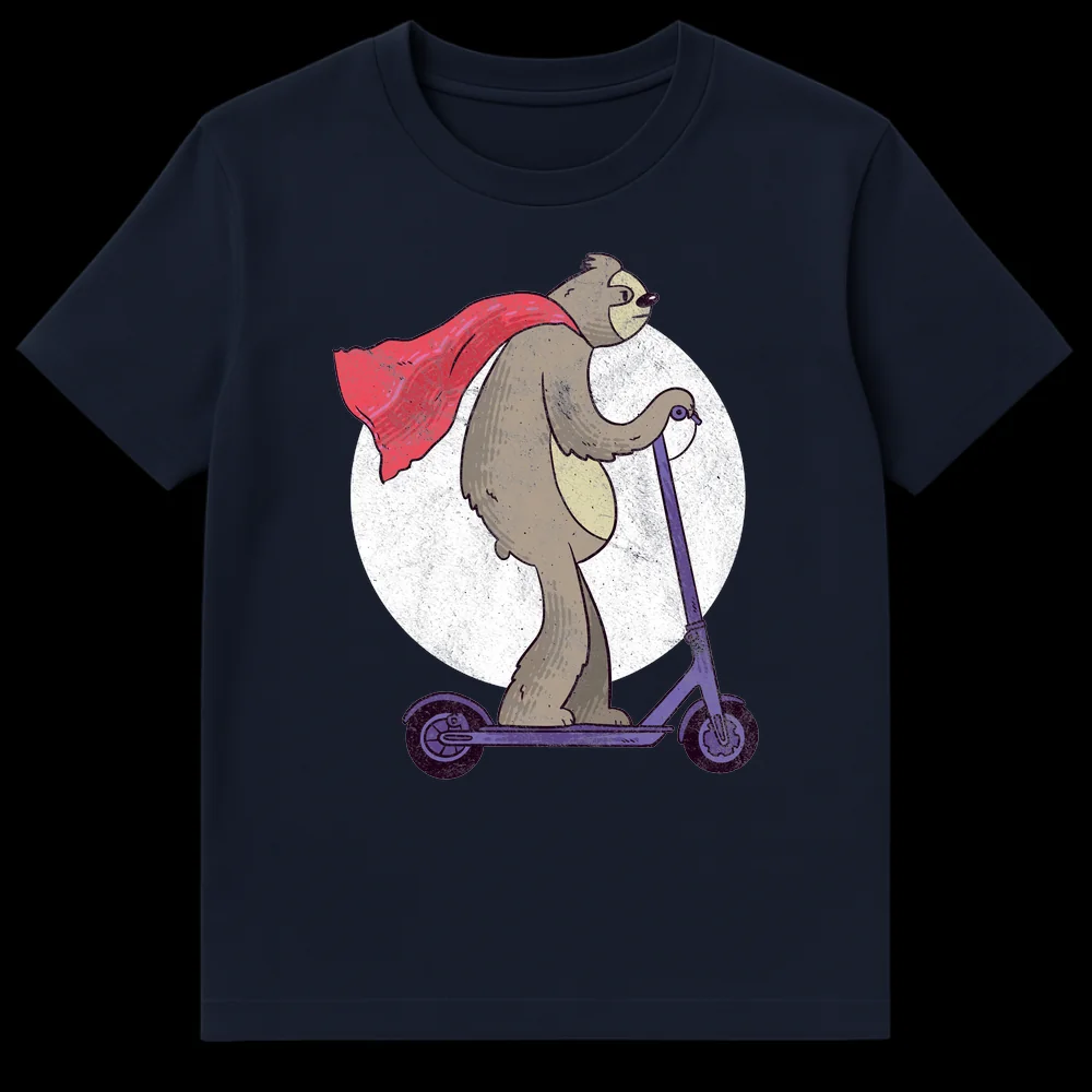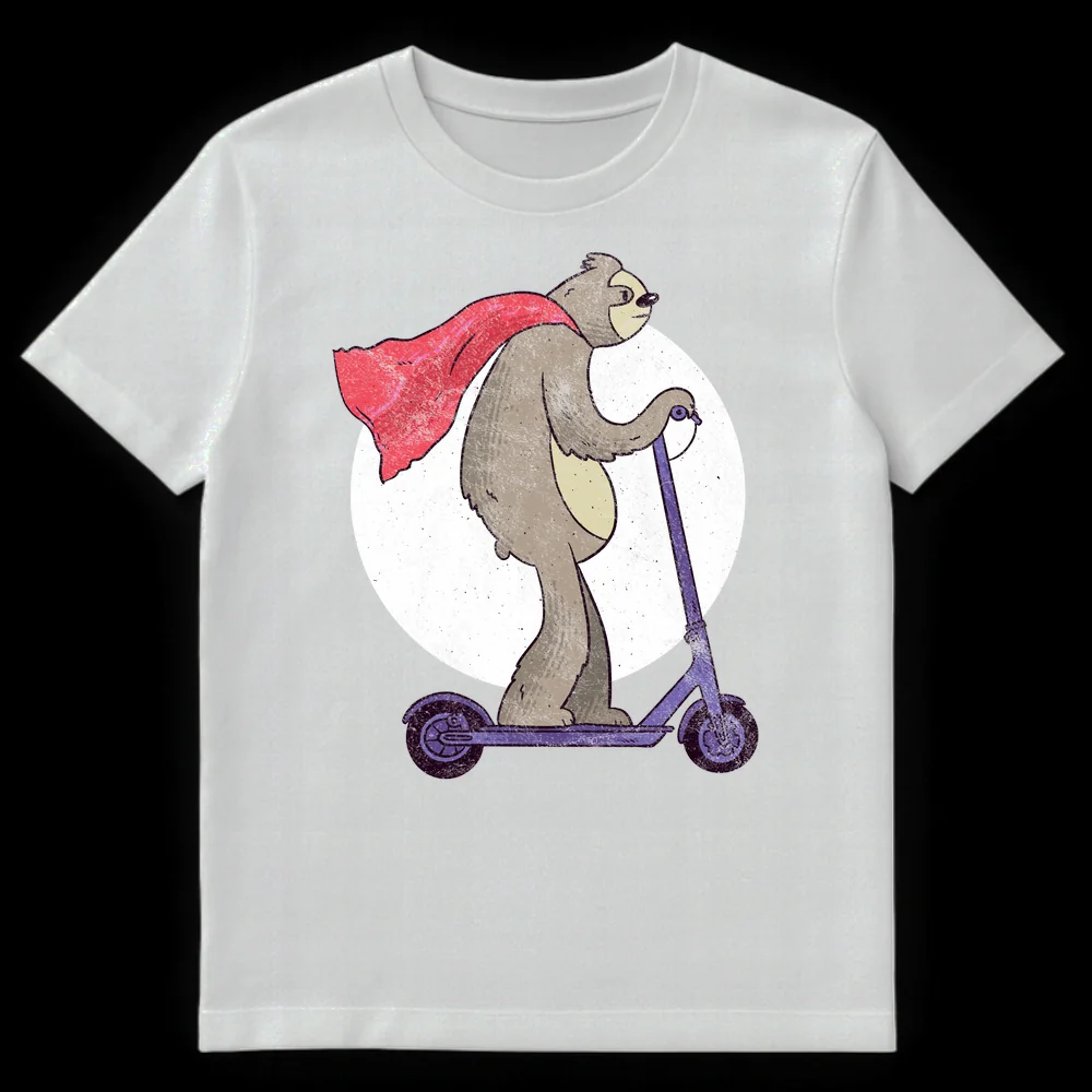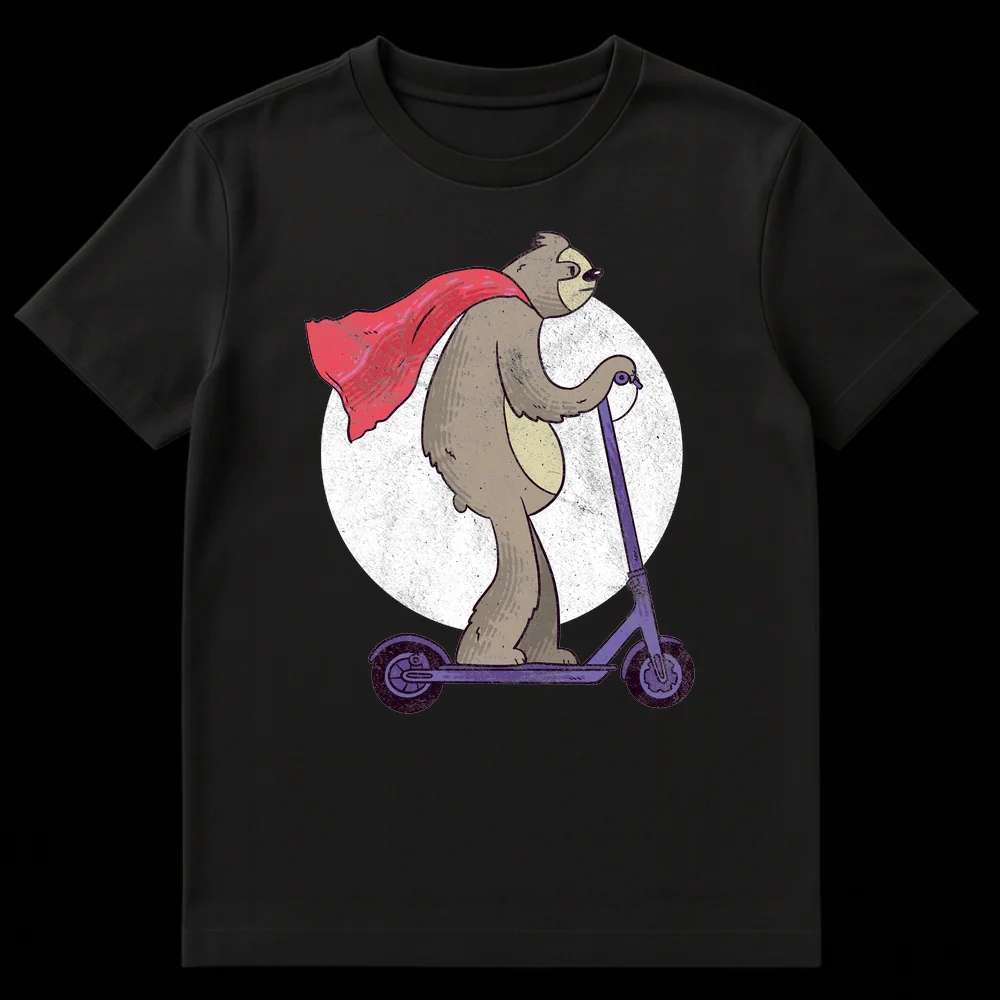 Embrace the irony with this hilarious t-shirt featuring a cape-wearing sloth valiantly riding an electric scooter. This design perfectly captures the essence of a ‘super-slow’ hero, combining the legendary slowness of sloths with iconic superhero flair. The distressed, hand-drawn style gives it a unique, vintage appeal, making it a perfect conversation starter. Ideal for sloth enthusiasts, fans of quirky humor, or anyone who appreciates taking life at their own pace.