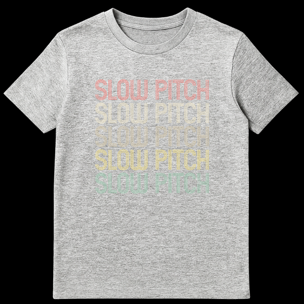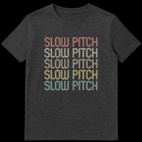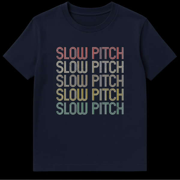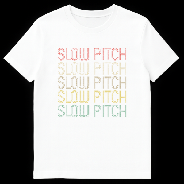 Step up to the plate in style with our unique ‘SLOW PITCH’ t-shirt, perfect for any slow pitch softball enthusiast. This design captures the heart of recreational softball with its repeated, vertically stacked typography that subtly emphasizes the game’s relaxed pace. Each ‘SLOW PITCH’ graphic boasts a retro, distressed texture in muted, earthy tones—salmon, tan, olive, yellow, and teal—creating a cool, vintage aesthetic against a stark black background. It’s more than just a shirt; it’s a statement of identity and a tribute to the good times on the diamond. An excellent gift for slow pitch players, team members, coaches, or anyone who loves the sport’s casual, fun-loving spirit. Celebrate every slow pitch game day!