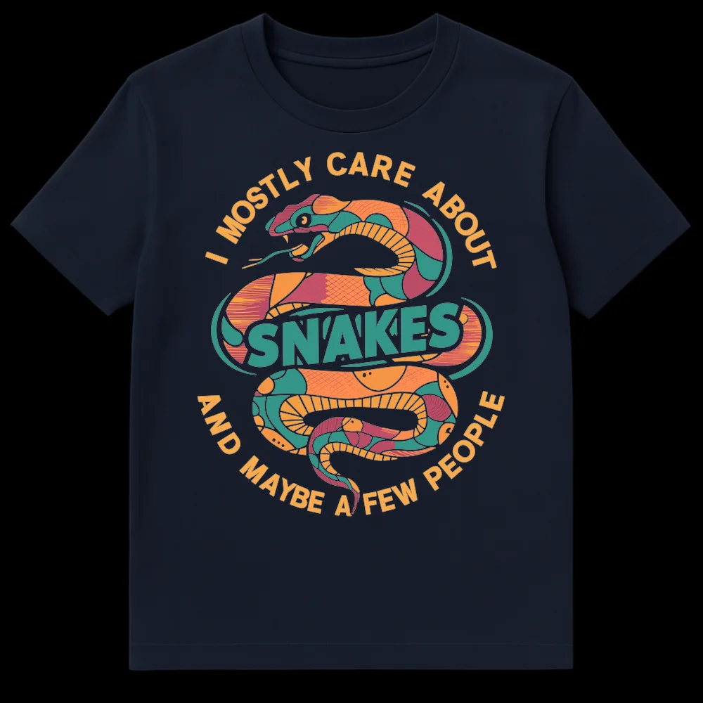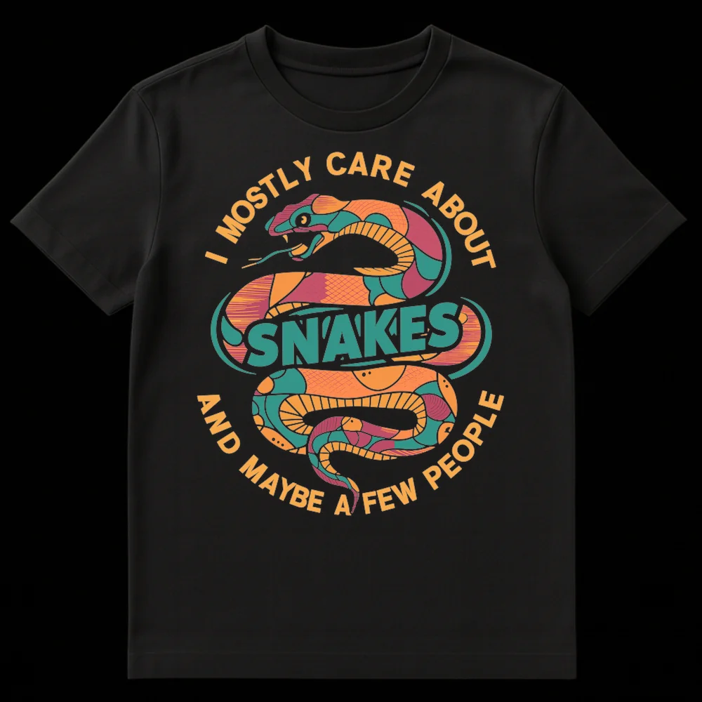 Express your unique priorities with this vibrant snake t-shirt. Featuring the humorous slogan “I MOSTLY CARE ABOUT SNAKES AND MAYBE A FEW PEOPLE,” this design is perfect for reptile lovers and playful introverts alike. The stylized, segmented snake graphic makes it a striking statement piece. A fantastic gift for anyone who cherishes their scaly friends more than social conventions.