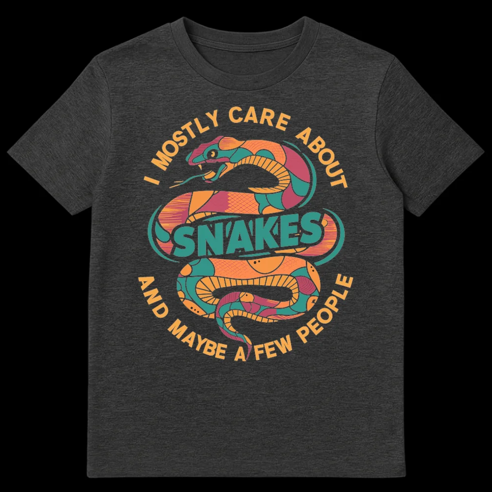 Celebrate your passion for serpents and your witty introverted side with this eye-catching t-shirt. The bold design showcases a stylized, segmented mosaic snake in vibrant teal, orange, and berry tones, making a truly unique visual statement. The phrase “I MOSTLY CARE ABOUT SNAKES AND MAYBE A FEW PEOPLE” perfectly captures the playful misanthropic humor and deep affection many animal lovers feel. This tee isn’t just clothing; it’s a conversation starter and a badge of honor for snake enthusiasts, reptile owners, and those who appreciate dry, sarcastic wit. It’s the ultimate gift for herpetology fans or anyone who finds more joy in the company of their pets than the complexities of human interaction.