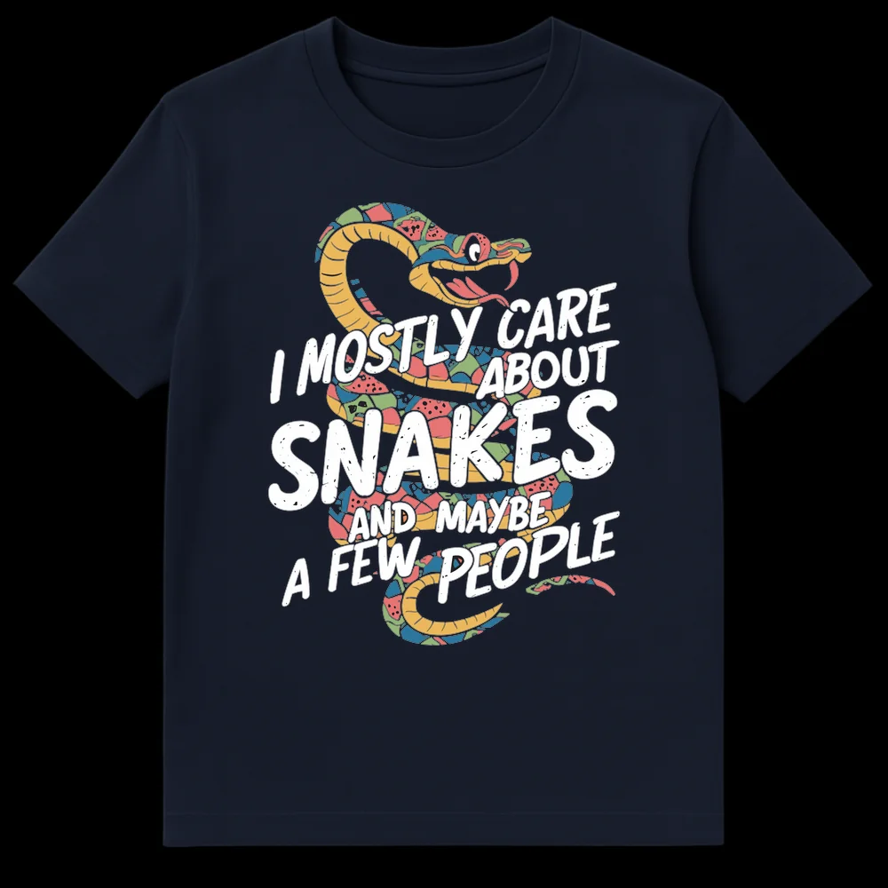 Flaunt your true affections with our captivating “I MOSTLY CARE ABOUT SNAKES AND MAYBE A FEW PEOPLE” t-shirt. This design masterfully blends a distressed comic style with bold typography, showcasing a friendly yet mischievous multi-colored cartoon snake. Its mosaic-like scales in vibrant greens, blues, reds, and yellows stand out against the stark black background, making a vivid statement. The humor lies in the relatable, sarcastic preference for snakes over humans, appealing to introverts, reptile enthusiasts, and anyone with a dry, self-deprecating wit. It’s more than just a shirt; it’s a badge of honor for those who connect deeply with their cold-blooded friends. Perfect for snake owners, herpetologists, or animal lovers with a quirky edge, this tee is designed to spark conversations and convey your unique personality with a smile.