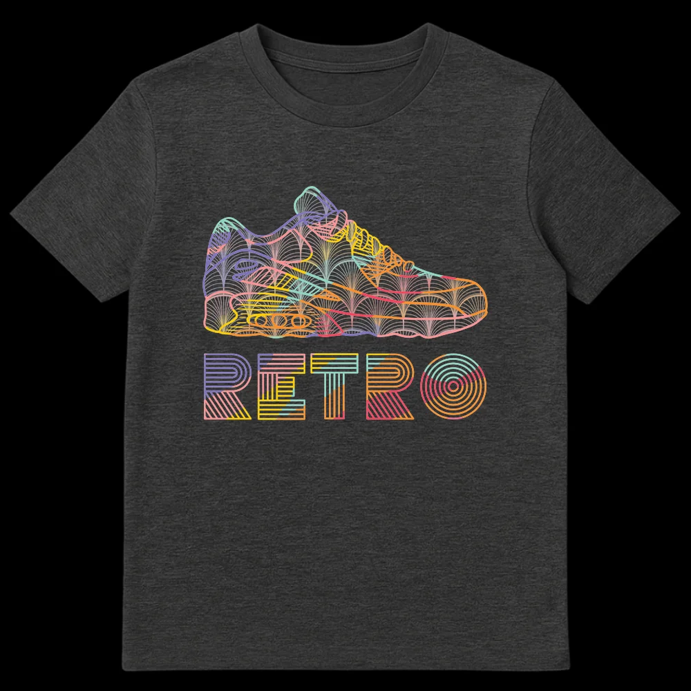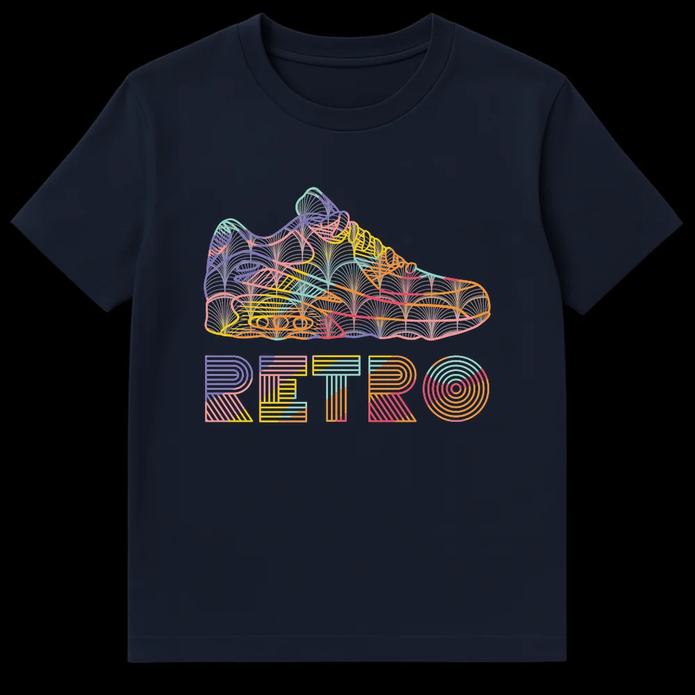 Embrace 80s and 90s nostalgia with this vibrant “RETRO” t-shirt, featuring a stylized athletic sneaker in a unique vaporwave aesthetic. The intricate line art and dynamic color palette make this a standout piece, celebrating vintage footwear and iconic design. Perfect for sneaker enthusiasts and anyone who loves retro pop culture.