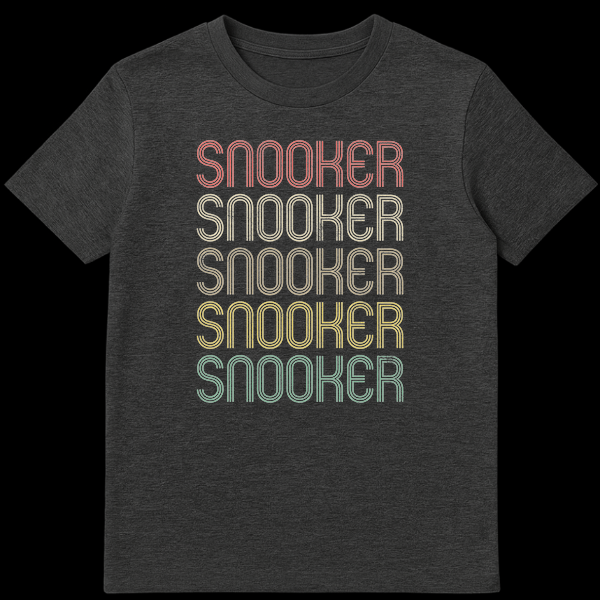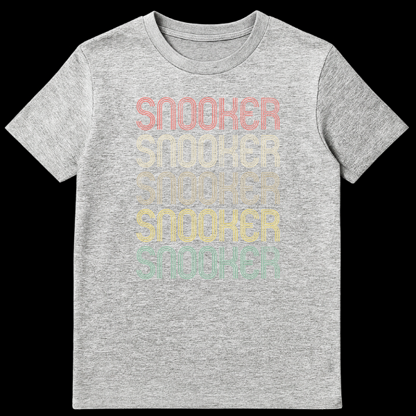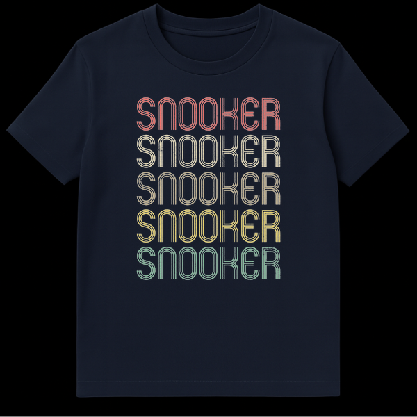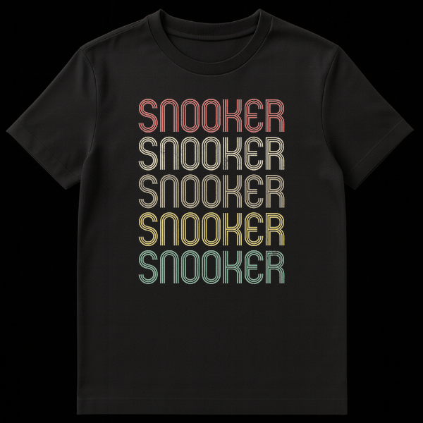 Declare your passion for the game with this unique snooker t-shirt. Featuring the word “SNOOKER” repeated five times in a distinctive retro 70s to early 80s typography with a grunge distressed texture. The muted, vintage-inspired colors on a black background create a stylish, nostalgic aesthetic. It’s the perfect gift for any snooker player or dedicated fan.