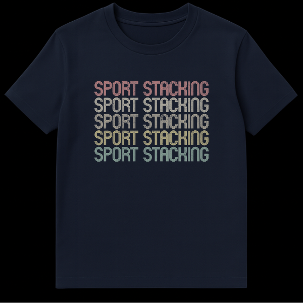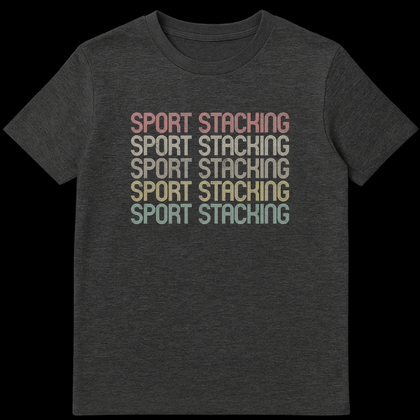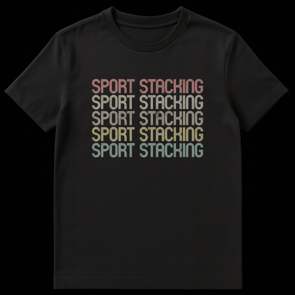 Celebrate your passion for speed stacking with this unique retro-inspired t-shirt. Featuring the “SPORT STACKING” motto repeated in a vintage striped font and warm, graduated colors, this design proudly showcases your dedication to the sport. It’s the perfect gift for any sport stacking competitor, coach, or enthusiast who loves unique athletic apparel.