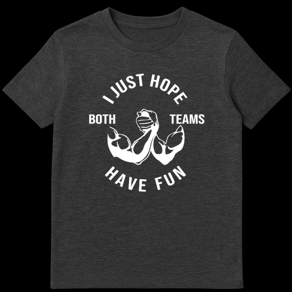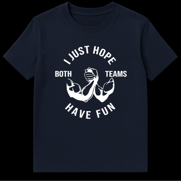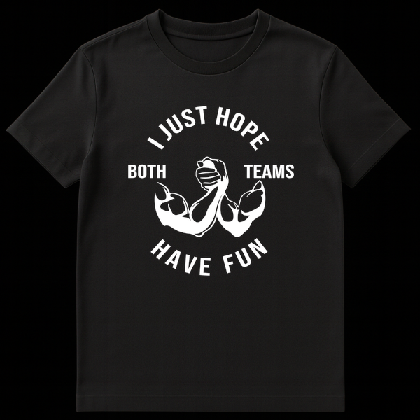 Show off your love for healthy competition and a positive mindset with our “I JUST HOPE BOTH TEAMS HAVE FUN” t-shirt. This design captures the essence of sportsmanship with a lighthearted twist, ideal for athletes, gamers, or anyone who enjoys watching a good match. The central illustration of two powerful arms engaged in an arm-wrestling grip perfectly visualizes the competitive yet friendly message, making it uniquely engaging. Printed on a high-contrast black background with bold white text and illustration, this tee ensures you stand out. It’s a fantastic gift for sports enthusiasts, coaches, teammates, or that friend who always brings a good vibe to any competitive event. Celebrate the joy of play and fair competition in style!